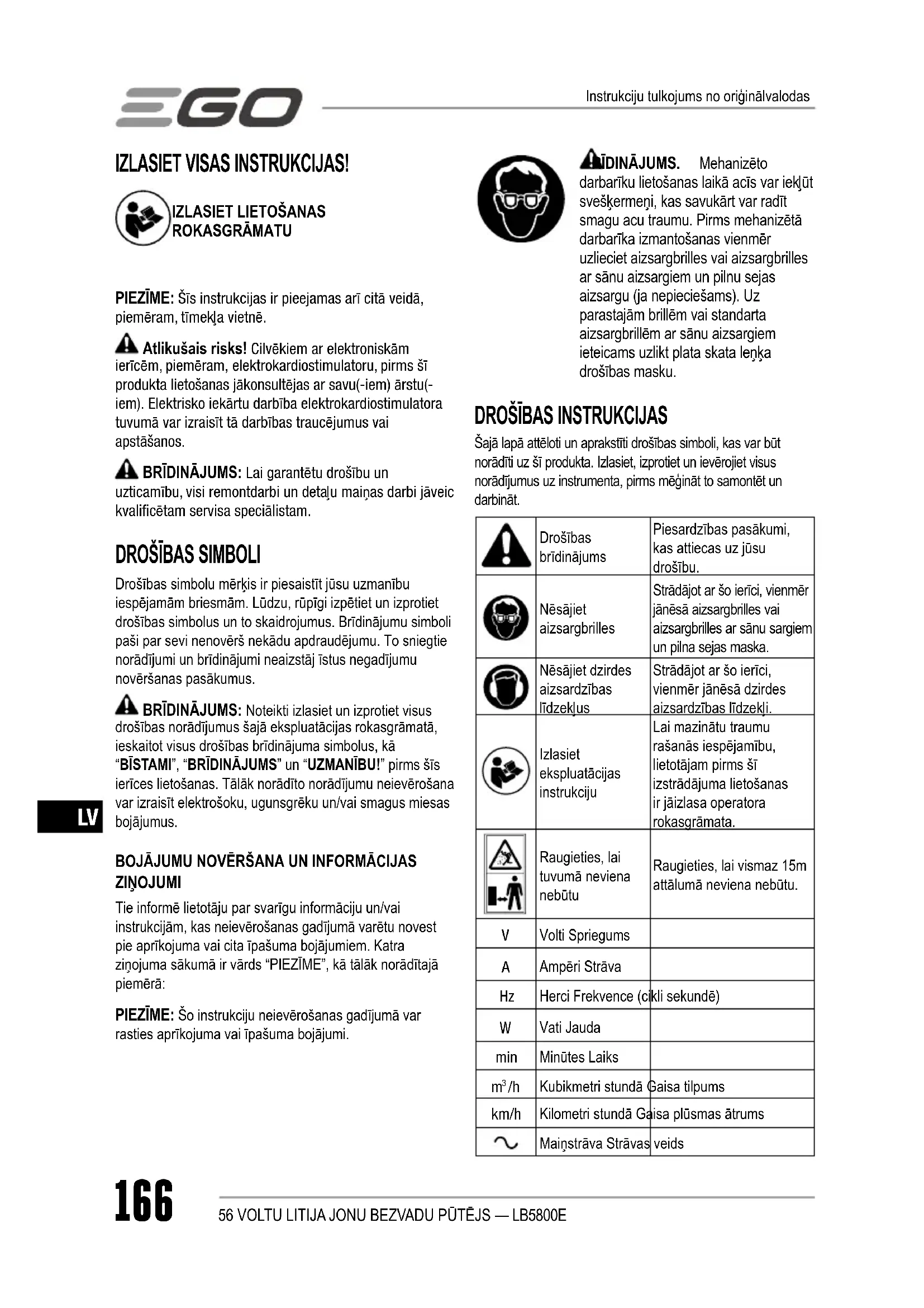 Drošības simbolu mērķis ir piesaistīt jūsu uzmanību iespējamām briesmām. Lūdzu, rūpīgi izpētiet un izprotiet drošības simbolus un to skaidrojumus. Brīdinājumu simboli paši par sevi nenovērš nekādu apdraudējumu. To sniegtie norādījumi un brīdinājumi neaizstāj īstus negadījumu novēršanas pasākumus. BRĪDINĀJUMS: Noteikti izlasiet un izprotiet visus drošības norādījumus šajā ekspluatācijas rokasgrāmatā, ieskaitot visus drošības brīdinājuma simbolus, kā “BĪSTAMI”, “BRĪDINĀJUMS” un “UZMANĪBU!” pirms šīs ierīces lietošanas. Tālāk norādīto norādījumu neievērošana var izraisīt elektrošoku, ugunsgrēku un/vai smagus miesas bojājumus. BOJĀJUMU NOVĒRŠANA UN INFORMĀCIJAS ZIŅOJUMI Tie informē lietotāju par svarīgu informāciju un/vai instrukcijām, kas neievērošanas gadījumā varētu novest pie aprīkojuma vai cita īpašuma bojājumiem. Katra ziņojuma sākumā ir vārds “PIEZĪME”, kā tālāk norādītajā piemērā: PIEZĪME: Šo instrukciju neievērošanas gadījumā var rasties aprīkojuma vai īpašuma bojājumi.56 VOLTU LITIJA JONU BEZVADU PŪTĒJS — LB5800E