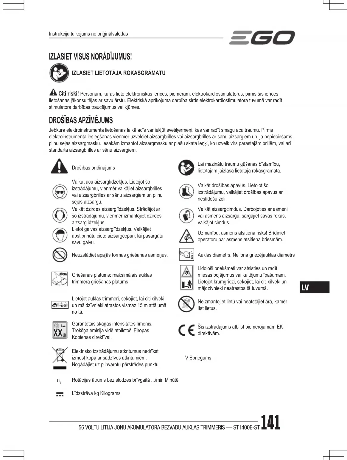 ST1401EST - Zāles trimmeris EGO - Bezmaksas lietošanas instrukcija