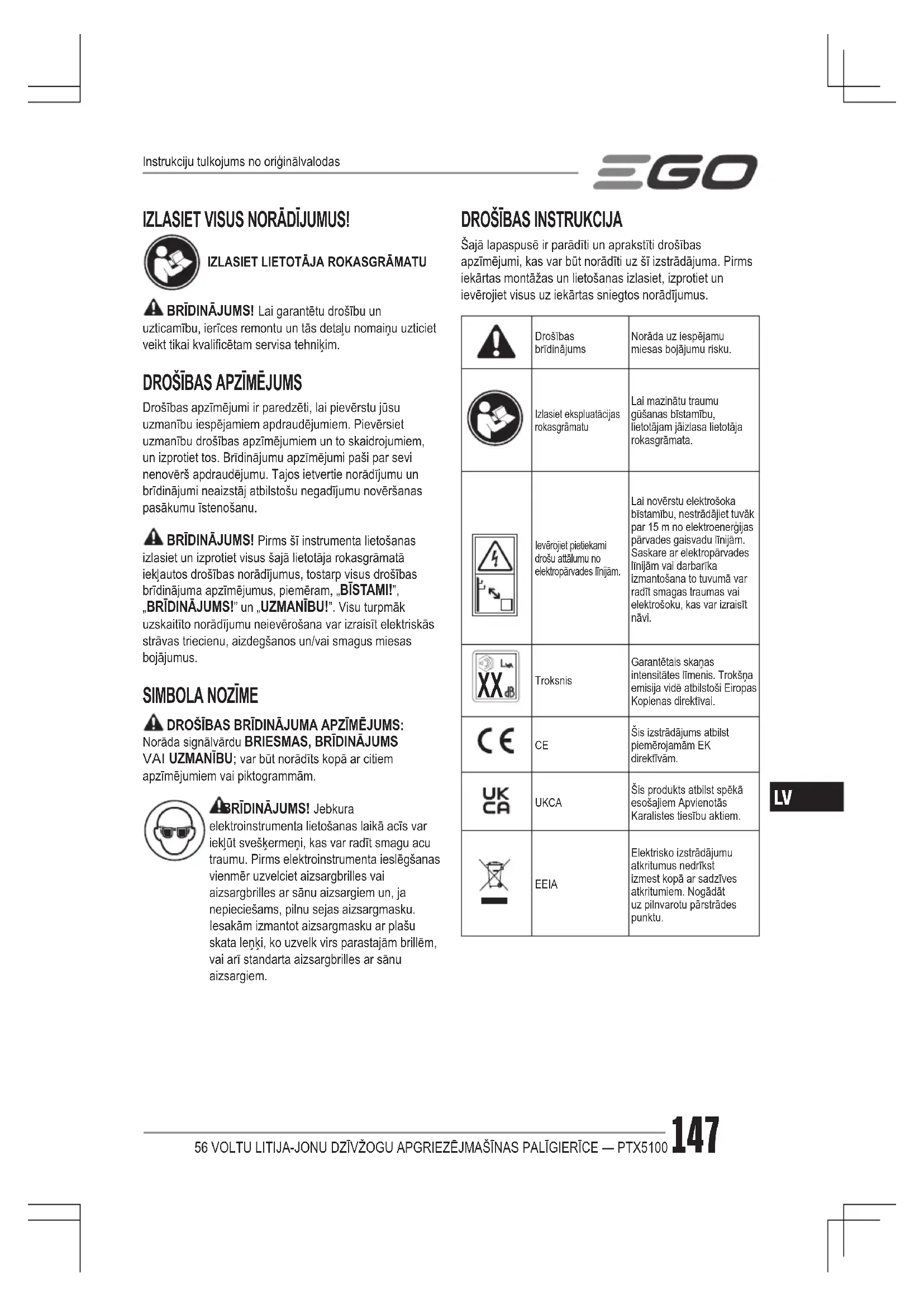 LIETOŠANAS INSTRUKCIJA PTX5100 EGO