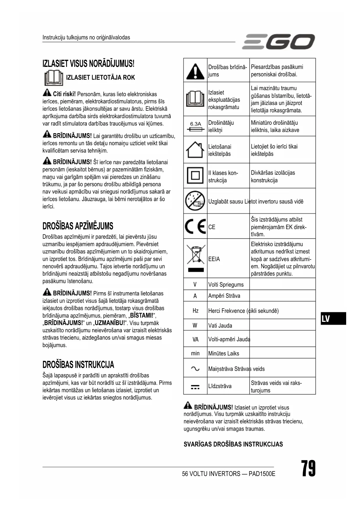 LIETOŠANAS INSTRUKCIJA PAD1500E EGO