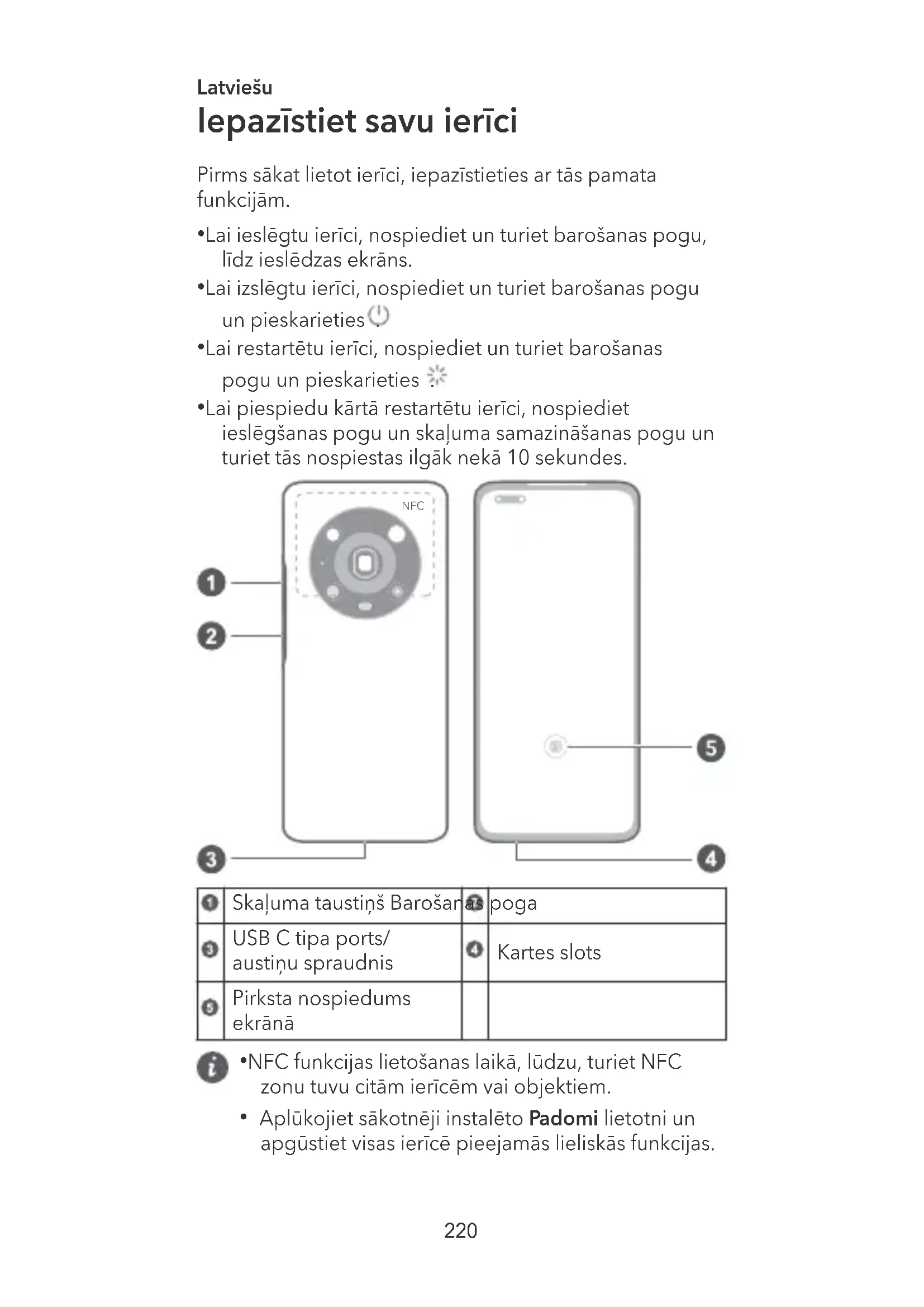 219Latviešu Iepazīstiet savu ierīci Pirms sākat lietot ierīci, iepazīstieties ar tās pamata funkcijām.
