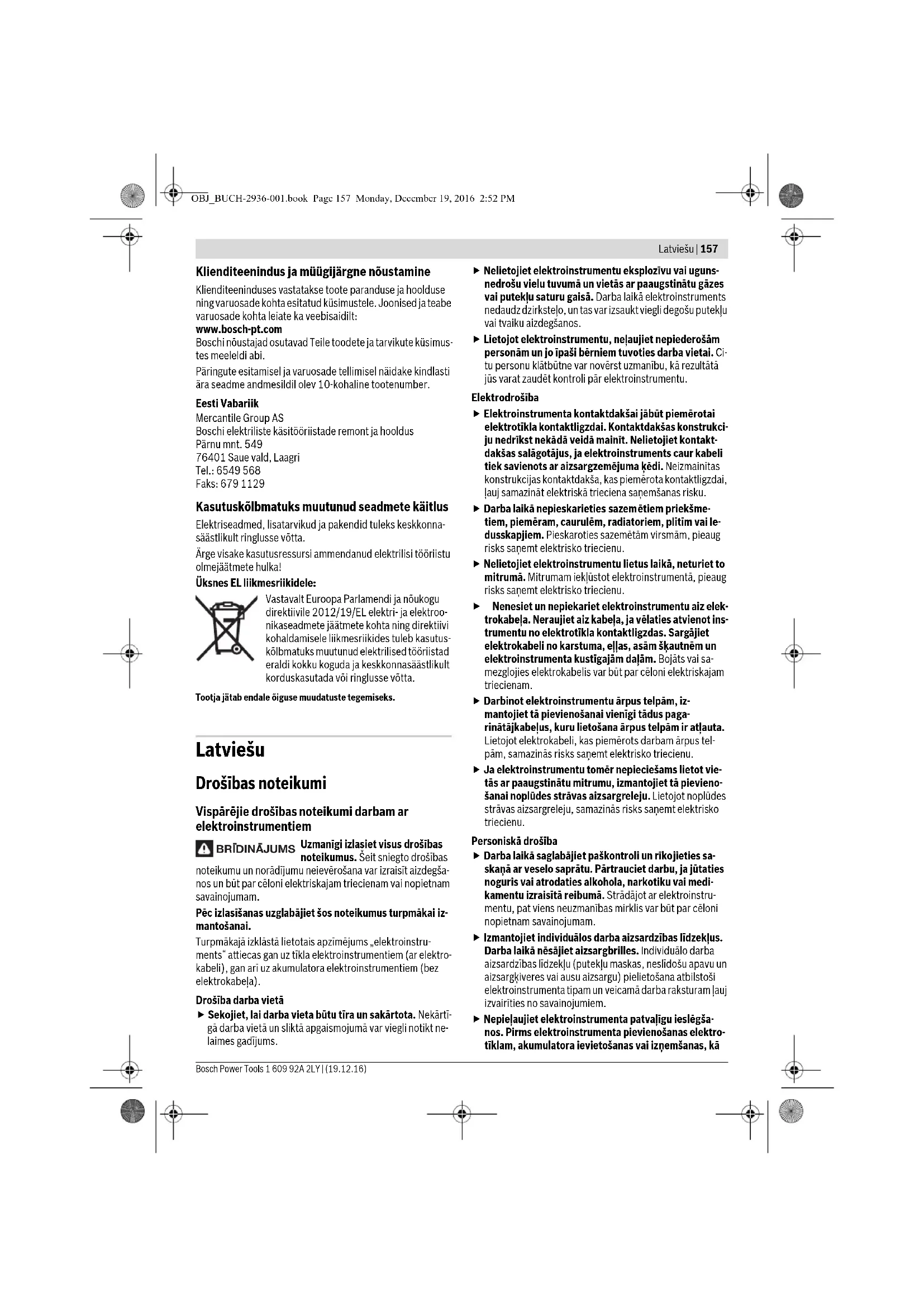 Ātrā izslēgšanās (Kickback Control – atsitiena kontro- le) ļauj uzlabot kontroli pār elektroinstrumentu un pa- augstina lietotāja aizsardzības pakāpi salīdzinājumā ar elektroinstrumentiem bez atsitiena kontroles funkci- jas. Elektroinstrumentam pēkšņi, neparedzēti pagrie- žoties ap urbja asi, tas izslēdzas. Lai atgrieztos normālas darbības režīmā, atlaidiet un no jau- na nospiediet ieslēdzēju. Ja nedarbojas atsitiena kontroles funkcija Kickback Control, urbjmašīnu vairs nav iespējams ieslēgt. No- drošiniet, lai elektroinstrumentu remontētu vienīgi kvalificēts speciālists, nomaiņai izmantojot tikai oriģi- nālās rezerves daļas. Griešanās ātruma/triecienu biežuma regulēšana Ieslēgta elektroinstrumenta griešanās ātrumu/triecienu bie- žumu var bezpakā pju veidā regulēt, mainot spiedienu uz ieslē- dzēju 6. Viegls spiediens uz ieslēdzēju 6 atbilst nelielam griešanās āt- rumam/triecienu biežumam. Palielinot spiedienu, pieaug arī griešanās ātrums/triecienu biežums. Griešanās ātruma/triecienu biežuma priekšiestādīšana Ar regulatora 7 palīdzību var iestādīt vēlamo griešanās ātru- ma/triecienu biežuma maksimālo vērtību, kas ir iespējams arī instrumenta darbības laikā. Optimālais darbvārpstas griešanās ātrums/triecienu biežums ir atkarīgs no apstrādājamā materiāla īpašībām, un to nosaka praktisku m ēģinājumu ceļā. Norādījumi darbam Pirms elektroinstrumenta apkopes vai apkalpošanas izvelciet tā elektrokabeļa kontaktdakšu no barojošā elektrotīkla kontaktligzdas. Kontaktējiet darbinstrumentu ar uzgriezni vai skrūvi ti- kai laikā, kad elektroinstruments ir izslēgts. Rotējošs darbinstruments var noslīdēt no skrūves galvas. Ja elektroinstruments tiek ilgstoši darbināts ar nelielu grieša- nās ātrumu, tas laiku pa laikam jāatdzesē, aptuveni 3 minūtes ļaujot darboties brīvgaitā ar maksimālo griešanās ātrumu. Apkalpošana un apkope Apkalpošana un tīrīšana Pirms elektroinstrumenta apkopes vai apkalpošanas izvelciet tā elektrokabeļa kontaktdakšu no barojošā elektrotīkla kontaktligzdas. Lai nodrošinātu ilgstošu un nevainojamu elektroin- strumenta darbību, uzturiet tīru tā korpusu un ventilā- cijas atveres. Ja nepieciešams nomainīt elektrotīkla kabeli, tas jāveic firmas Bosch elektroinstrumentu servisa centrā vai Bosch pilnvarotā elektroinstrumentu remonta darbnīcā, jo tā tiks saglabāts va- jadzīgais darba drošības līmenis. Klientu konsultāciju dienests un konsultācijas par lietošanu Klientu konsultāciju dienesta darbinieki atbildēs uz Jūsu jau- tājumiem par izstrādājuma remontu un apkalpošanu, kā arī par rezerves daļu iegādi. Izklājuma zīmējumus un informāciju par rezerves daļām var atrast arī interneta vietnē: www.bosch-pt.com Bosch klientu konsultāciju grupa centīsies Jums palīdzēt vis- labākajā veidā, sniedzot atbildes uz jautājumiem par mūsu iz- strādājumiem un to piederumiem. Pieprasot konsultācijas un pasūtot rezerves daļas, noteikti paziņojiet 10 zīmju izstrādājuma numuru, kas norādīts uz iz- strādājuma marķējuma plāksnītes. Latvijas Republika Robert Bosch SIA Bosch elektroinstrumentu servisa centrs Mūkusalas ielā 97 LV-1004 Rīga Tālr.: 67146262 Telefakss: 67146263 E-pasts: service-pt@lv.bosch.com Atbrīvošanās no nolietotajiem izstrādājumiem Nolietotie elektroinstrumenti, to piederumi un iesaiņojuma materiāli jānogādā otrreizējai pārstrādei apkārtējai videi ne- kaitīgā veidā. Neizmetiet elektroinstrumentu sadzīves atkritumu tvertnē! Tikai ES valstīm Saskaņā ar Eiropas Savienības direktīvu 2012/19/ES par nolietotajām elektriskajām un elektroniskajām ierīcēm un šīs direktīvas atspoguļojumiem nacionālajā likumdošanā, lietošanai nederīgie elektroinstrumenti jāsa- vāc atsevišķi un jānogādā otrreizējai pārstrā- dei apkārtējai videi nekaitīgā veidā