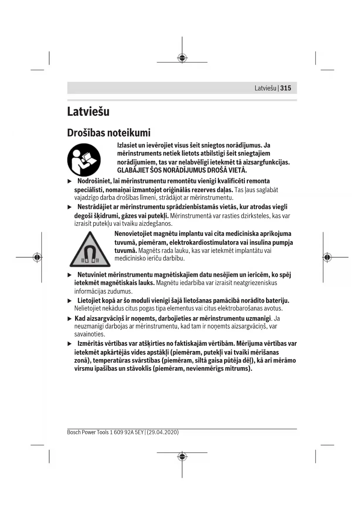 - %) – sarkans: kritisks koksnes mitrums (>20%) Mērījuma vērtības saglabāšana Lai saglabātu mērījuma vērtību, uz īsu brīdi nospiediet ieslēgšanas/izslēgšanas/ turēšanas taustiņu (1). Saglabātās mērījumu vērtības tiek parādītas displeja (3) apakšējā rindā (b). Jauna mērījumu vērtība parādās rindā displeja (3) rindā (a). Pēc jaunās mērījuma vērtības saglabāšanas apakšējā rindā (b) iepriekšējā mērījuma vērtība tiek parādīta augšējā rindā (b) utt. Displejā (3) var saglabāt divas mērījuma vērtības (b). Saglabātās mērījuma vērtības (b) tiek parādītas ar izvēlēto koksnes grupu un mitruma simbolu ūdens pilienu veidā: – 1 ūdens piliens (atbilst zaļā gaismas diode): nekritisks koksnes mitrums (<12%) – 2 ūdens pilieni (atbilst dzeltena gaismas diode): aizdomīgs koksnes mitrums (12% %) – 3 ūdens pilieni (atbilst sarkanā gaismas diode): kritisks koksnes mitrums (>20%) Padoms: šis rādījums ir noderīgs, ja displejs (3) no noteikta leņķa nav redzams vai jāveic salīdzinošie mērījumi. Izslēdzot mērinstrumentu, saglabātās mērījumu vērtības tiek dzēstas. Bosch Power Tools 1 609 92A 5EY | (29.04.2020)322 | Latviešu Pielietojuma piemēri un orientējošās vērtības koksnes mitrumam koka būvēm Koksnes mitrums mērījums: – malkai pirms kurināšanas: novērš dūmu veidošanos un samazina atgāzes; – parketam pirms uzstādīšanas: novērš plaisu rašanos pēc ieklāšanas – mēbeļu izgatavošanai paredzētajai koksnei: novērš deformāciju, pelējuma veidošanos, insektu uzbrukumu un plaisas; – koka mājām/dārza mājām: novērš pelējuma veidošanos un noņem ūdens radītus bojājumus; – koka dzīvojamajiem vagoniņiem: pirms dzīvojamā vagoniņa pirkšanas/nomāšanas var pasargāt to no pelējuma vai pussakritušām vietām. Dotajā tabulā parādīts tipiskais koksnes mitrums dažādiem pielietojumiem. Izmantošanas joma Koksnes mitrums [%] Piemēri No visām pusēm slēgtas koka būves ar apkuri 9 ± 3 piem., galdi, krēsli, skapji dzīvojamajā istabā/virtuvē (apkures laikā ziemā) No visām pusēm noslēgtas būves bez apkures 12 ± 3 piem., pagrabu skapi (bez apkures) Vaļējas būves zem jumta 15 ± 3 piem., automašīnu nojumes Konstrukcijas, uz kurām no visām pusēm iedarbojas laika apstākļi 18 ± 6 piem., dārza māju ārējās sienas Citi koksnes mitrumi: – Koka mājas būve: maks. 18% – Parkets: 9% ± 2% – Grīda: maks. 12% – Grīdas sagatave: maks. 20% – Apakšgrīda: maks. 15% – Kāpnes: 9% ± 3% – Malka: maks. 22% (optimāls <17%) Paštestēšanas funkcija Paštestēšanas funkcija pārbaude mērinstrumenta darbību. Ieslēdziet mērinstrumentu (skatīt „Ieslēgšana un izslēgšana“, Lappuse320). 1 609 92A 5EY | (29.04.2020) Bosch Power ToolsLatviešu | 323 Noņemiet aizsargvāciņu (6). Turiet tapas (5) pie metāliskajiem kontaktiem (12) aizsargvāciņa aizmugurē (6) (skatīt attēlu C). Salīdziniet vērtību displejā ar uzdrukātajām vērtībām uz aizsargvāciņa (6) atbilstoši iestatītajai koksnes grupai: – koksnes grupa A: 11,1%–11,9% – koksnes grupa B: 9,8%–10,4% Ja vērtības nesakrīt, ar sava pārdevēja starpniecību nododiet mērinstrumentu Bosch klientu apkalpošanas dienestam. Norādījumi darbam Ārējo faktoru ietekme uz mērījumu rezultātiem Vislielākā mērījumu precizitāte ir tad, ja apkārtējā gaisa temperatūra sakrīt ar mērāmās koksnes temperatūru. Mērījuma rezultātu var ietekmēt: – koksnes grupa un koksnes apakšgrupa; – mērāmā koksnes gabala temperatūra; – mērāmā koksnes gabala iedalījums serdē un aplievā; – tapu iespraušanas dziļums mērāmajā koksnes gabalā; – mērāmā koksnes gabala virsmas apstrāde (piem., eļļas vai laka); – mērījums paralēli vai perpendikulāri mērāmās koksnes struktūrai vai svēdrainumam; – mitruma sadalījums; – mērīšanas punkts (piem., koksnes gabala vidū vai galā); – koksnes gabala stāvoklis un veids: koksnei jābūt bez puvumiem, zaru vietām un citiem defektiem. Uzmanību: ja nepieciešamas precīzas vērtības, jāveic mērījums pēc Darr metodes (precīza laboratorijas metode saskaņā ar DIN 52183). Kļūmes – cēloņi un novēršana Cēlonis Novēršana Brīdinājuma simbols (c), temperatūras rādījums (d) un „Err“ displejā Apkārtējā gaisa temperatūra ir ārpus pieļaujamo darba temperatūras robežām no –5 °C līdz +50 °C. Nogaidiet, līdz mērinstrumenta temperatūra atgriežas pieļaujamo temperatūras vērtību diapazona robežās. Koksnes grupai A: > 74,7% un „HI“ displejā Bosch Power Tools 1 609 92A 5EY | (29.04.2020)324 | Latviešu Cēlonis Novēršana Koksnes grupai B: > 61,9% un „HI“ displejā Koksnes mitrums ārpus mērīšanas diapazona (pārāk augsts) Jauns mērījums citā koksnes vietā. Rādījums „– –.–“ displejā Koksnes mitrums ārpus mērīšanas diapazona (pārāk zems) vai mērījums nav izpildīts pareizi Jauns mērījums citā koksnes vietā. Ikviena mērījuma laikā tiek kontrolēta mērinstrumenta pareiza funkcionēšana. Ja tiek atklāts defekts, displejā sāk mirgot „Err" un brīdinājuma simbols (c). Izslēdziet un atkal ieslēdziet mērinstrumentu. Ja kļūda joprojām pastāv, izņemiet baterijas un pēc dažām sekundēm atkal ielieciet. Ja ar šiem pasākumiem kļūdu neizdodas novērst, ar sava pārdevēja starpniecību nododiet mērinstrumentu Bosch klientu apkalpošanas dienestam. Apkalpošana un apkope Apkope un tīrīšana Ikreiz pirms lietošanas pārbaudiet mērinstrumentu. Ja mērinstrumentam ir redzami bojājumi vai tā iekšpusē ir vaļīgas daļas, vairs nav garantēts, ka mērinstruments darbojas droši. Glabājiet un transportējiet mērinstrumentu tikai piemērotā iesaiņojumā, piemēram, oriģinālajā iesaiņojumā. Ja mērinstrumentam nepieciešams remonts, nosūtiet to uz remonta uzņēmumu oriģinālaj