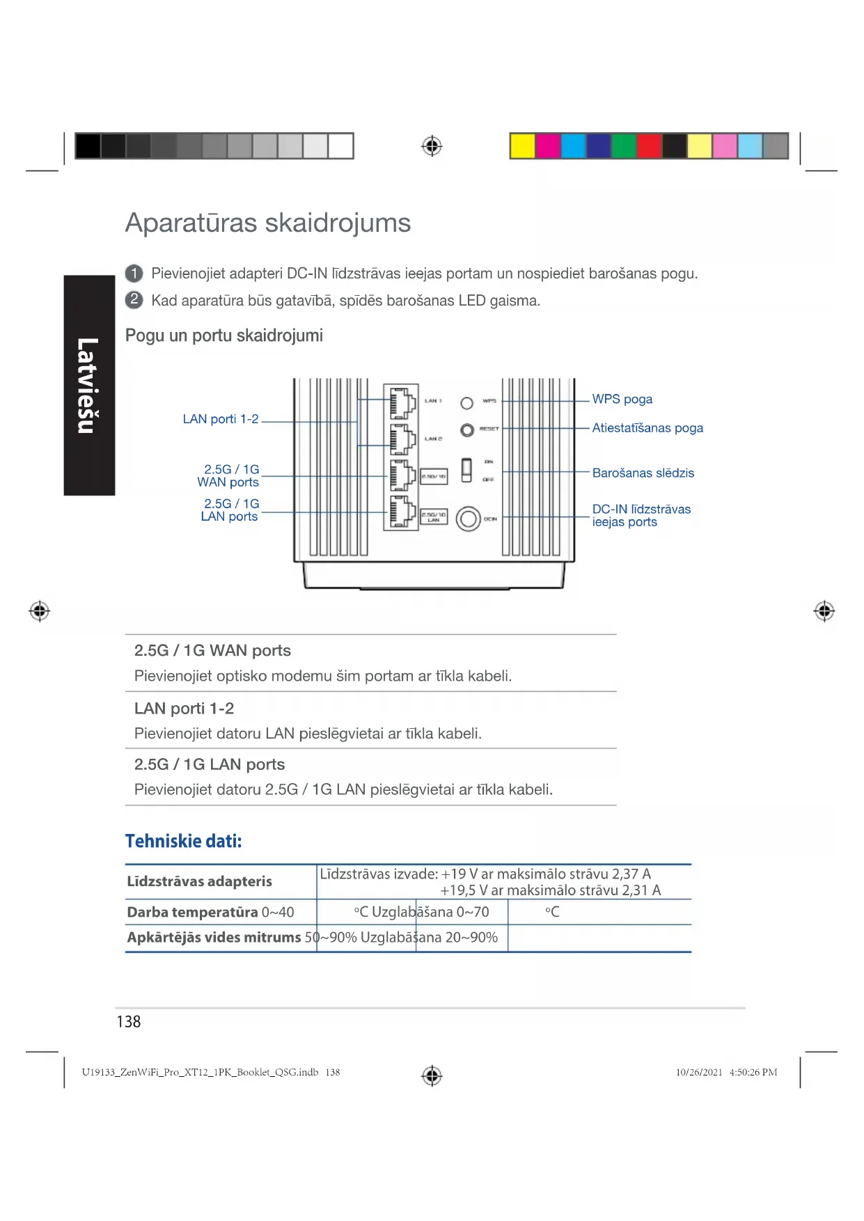 Pievienojiet adapteri DC-IN līdzstrāvas ieejas portam un nospiediet barošanas pogu. Kad aparatūra būs gatavībā, spīdēs barošanas LED gaisma. Aparatūras skaidrojums Pogu un portu skaidrojumi 2.5G / 1G WAN ports Pievienojiet optisko modemu šim portam ar tīkla kabeli. LAN porti 1-2 Pievienojiet datoru LAN pieslēgvietai ar tīkla kabeli. 2.5G / 1G LAN ports Pievienojiet datoru 2.5G / 1G LAN pieslēgvietai ar tīkla kabeli.DC-IN līdzstrāvas ieejas ports2.5G / 1G WAN portsLAN porti 1-2Līdzstrāvas adapterisLīdzstrāvas izvade: +19 V ar maksimālo strāvu 2,37A +19,5 V ar maksimālo strāvu 2,31ADarba temperatūra 0~40 C Uzglabāšana 0~70