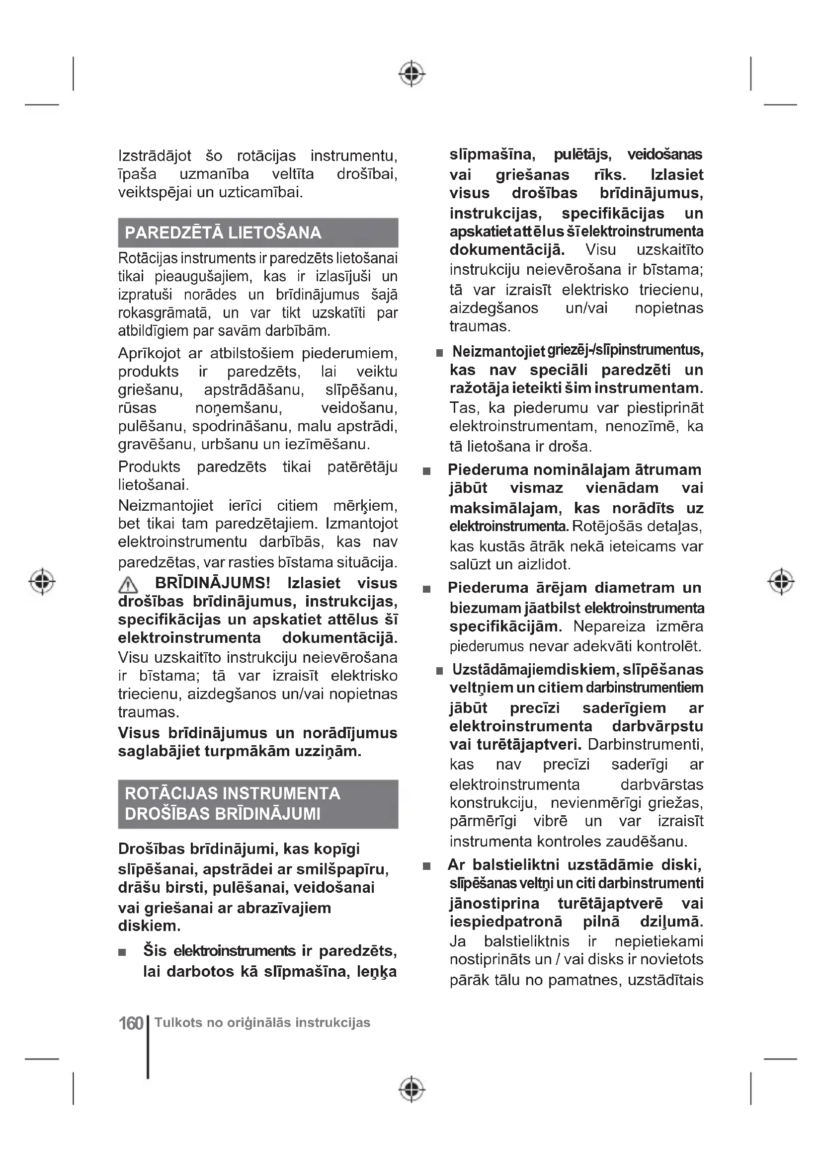Tulkots no oriģinālās instrukcijasvai volframa karbīda griezējam, tie var izlekt no rievas un jūs varat zaudēt kontroli pār instrumentu. Drošības brīdinājumi, kas īpaši attiecas uz slīpēšanu un abrazīvu griešanu ■ Izmantojiet tikai elektroinstrumentam ieteiktos diskus un tikai paredzētajos pielietojuma veidos. Piemēram, neslīpējiet ar griezējdiska sāniem. Abrazīvie griezējdiski ir paredzēti papildu slīpēšanai; šiem diskiem pielikts spēks no sāniem var tos salauzt. ■ Abrazīvajiem konusveida un apaļgala uzgaļiem ar vītni izmantojiet tikai nebojātus pareizā izmēra un garuma disku balstieliktņus ar nerievotu balstošo uzmalu. Atbilstoši balstieliktņi samazina plīsuma iespējamību. ■ Neļaujiet griešanas diskam iestrēgt un nelietojiet pārmērīgu spēku. Nemēģiniet griezt pārmērīgi dziļi. Diska pārmērīga noslogošana palielina slodzi uz motoru un rada iespēju diskam liekties vai iesprūst griezum, palielinot iespēju rasties atsitienam vai diska plīšanai. ■ Nenovietojiet jūsu rokas vienā līnijā vai aiz rotējoša diska. Kad disks darbības laikā virzās prom no jūsu rokas, iespējamais atsitiens var raut rotējošo disku un instrumentu tieši jums virsū. ■ Ja disks ieķeras vai iestrēgst, kā arī pārtraucot griešanu cita iemesla dēļ, izslēdziet elektroinstrumentu un turiet to nekustīgi līdz disks pilnībā apstājas. Nemēģiniet noņemt griezējdisku no griezuma, kamēr disks griežas, citādi varat saņemt atsitienu. Noskaidrojiet un novērsiet diska ieķeršanās vai iestrēgšanas cēloni. ■ Neatsāciet griešanu sagatavē. Ļaujiet diskam sasniegt pilnu ātrumu un uzmanīgi ievietojiet iegriezumā. Disks var ieķīlēties, novirzīties vai dot atsitienu, ja elektroinstruments tiek iedarbināts sagatavē. ■ Atbalstiet jebkuru lielizmēra sagatavi, lai samazinātu diska iespiešanas un atsitiena risku. Lielām sagatavēm ir tendence liekties zem pašu svara. Atbalsti ir jānovieto zem sagataves, tuvu griešanas līnijai un tuvu sagataves malai abās diska pusēs. ■ Īpaši uzmanieties, veicot kabatas veida griezumus ēku sienās vai citās apslēptās vietās. Izvirzījuma disks var griezt gāzes vai ūdens caurules, elektroinstalāciju, kas var radīt pretsitienu. Drošības brīdinājumi, kas attiecināmi uz tīrīšanu ar stiepļu suku ■ Ņemiet vērā, ka stiepļu sariņi tiek mesti no sukas pat parastas lietošanas laikā. Pārmērīgi nenoslogojiet sarus, pielietojot uz suku pārlieku lielu spiedienu. Stiepļu sari var vieglu caurdurt plānu apģērbu un/vai ādu. ■ Ļaujiet sukai griezties darba ātrumā vismaz vienu minūti pirms sākt to izmantot. Šajā laikā neviens nedrīkst atrasties sukas priekšā vai tās darba līnijā. Šajā sākotnējā rotācijas laikā tiks izmesti vaļīgi sari vai stieples. ■ Virziet rotējošās saru sukas izmešus prom no sevis. Šo suku lietošanas laikā mazas daļiņas vai LATVISKI