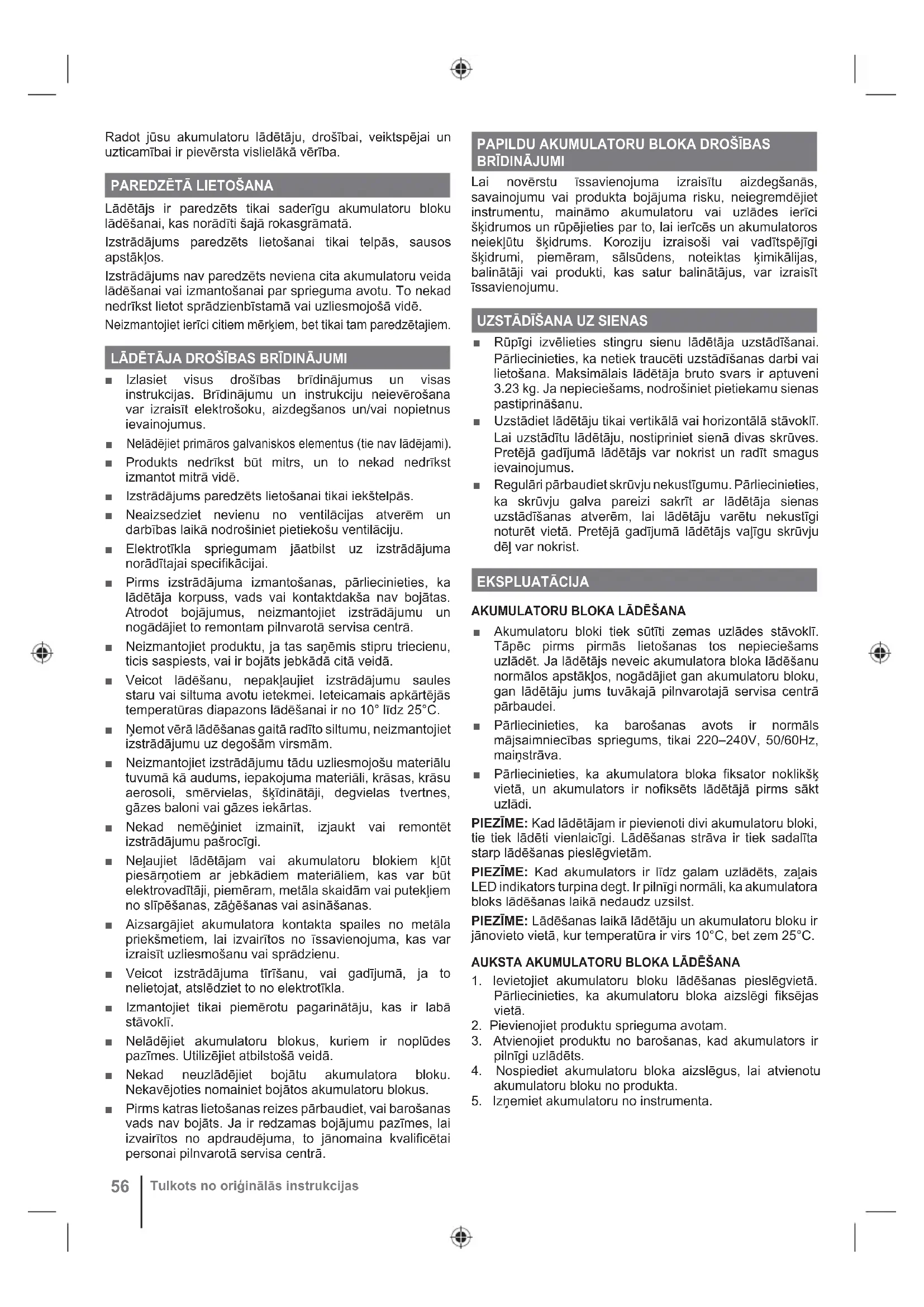 Tulkots no oriģinālās instrukcijasKARSTA AKUMULATORU BLOKA LĀDĒŠANA Izmantojot instrumentu nepārtraukti, akumulatora bloka šūnas sakarsīs. Sakarsušam akumulatoru blokam jāļauj atdzist aptuveni 30 minūtes pirms sākt to lādēt. APKOPE ■ Neizmantojot vai tīrot izstrādājumu, atvienojiet to no sprieguma avota un noņemiet akumulatora bloku. ■ Tīrot plastmasas daļas, izvairieties no šķīdinātāju lietošanas. Vairums plastikātu pakļaujas dažādu tirdzniecībā pieejamu šķīdinātāju iedarbībai. Putekļu un netīrumu noņemšanai izmantojiet tīru drānu vai mīkstu suku. ■ Nekad neļaujiet bremžu šķidrumiem, benzīnam, naftas produktiem un šķīdinošām eļļām nonākt saskarsmē ar plastikāta daļām. Šie produkti satur ķimikālijas, kas var bojāt, vājināt vai iznīcināt plastikātus. ■ Neizjauciet izstrādājumu, tā iekšienē ir bīstams spriegums. LĀDĒTĀJA TĪRĪŠANA ■ Pirms tīrīšanas atvienojiet lādētāja barošanas vadu no sprieguma padeves, lai novērstu smagus ievainojumus. ■ Notīriet lādētāja virsmu (izņemot etiķetes), izmantojot mitru drānu ar maigu mazgāšanas līdzekli. ■ Neizmantojiet plastmasas korpusa tīrīšanai agresīvus mazgāšanas līdzekļus. To var sabojāt noteiktas aromātiskās eļļas, piemēram, priedes un citrona, un šķīdinātāji, piemēram, petroleja. ■ Mitrums var izraisīt elektrības trieciena apdraudējumu. Noslaukiet jebkādu mitrumu ar mīkstu, sausu drānu. UZGLABĀŠANA ■ Glabājiet produktu vēsā, sausā vietā temperatūrā starp 10 un 38°C.