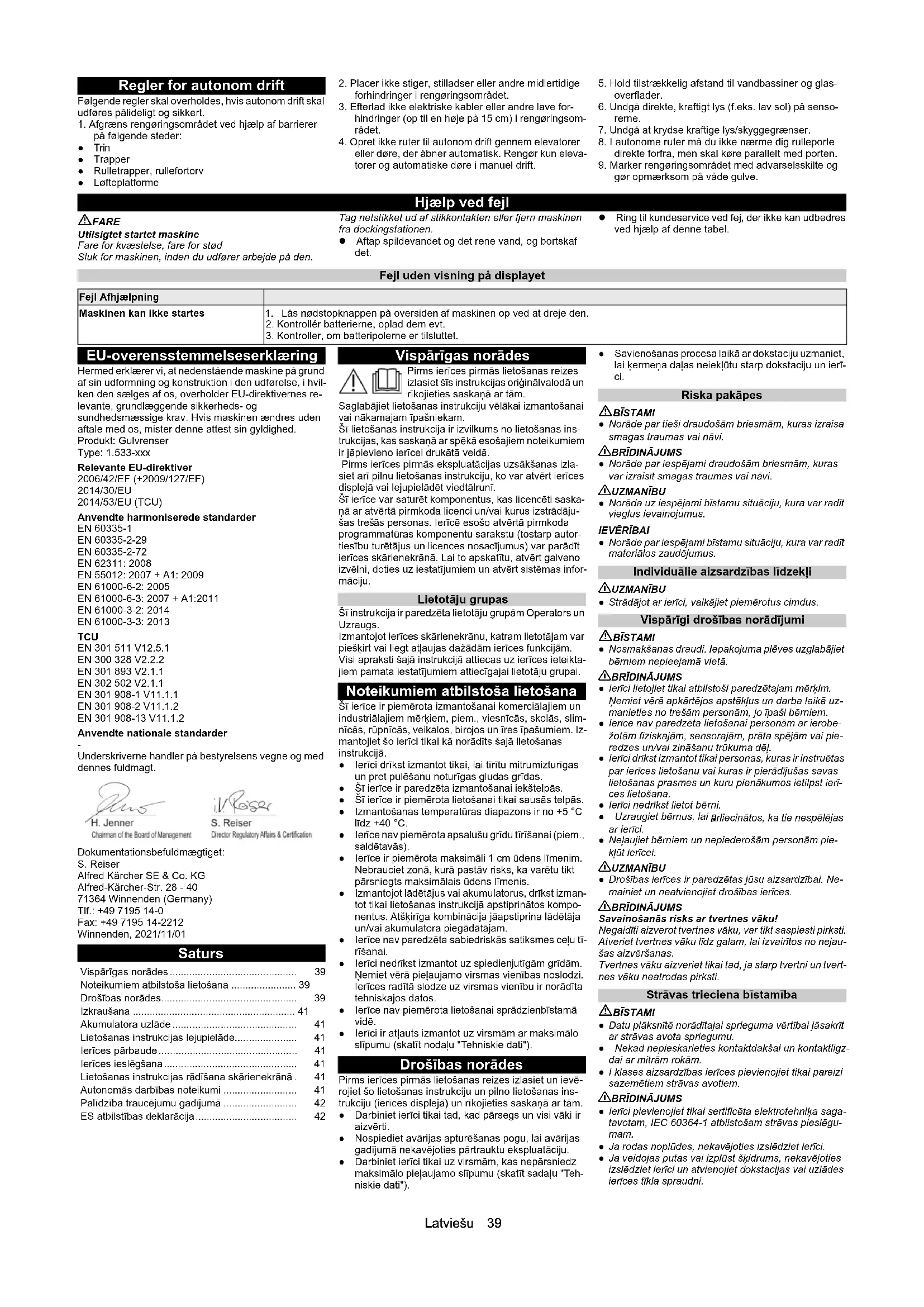 Underskriverne handler på bestyrelsens vegne og med dennes fuldmagt. Dokumentationsbefuldmægtiget: S. Reiser Alfred Kärcher SE & Co. KG Alfred-Kärcher-Str. 28 - 40 71364 Winnenden (Germany) Tlf.: +49 7195 14-0 Fax: +49 7195 14-2212 Winnenden, 2021/11/01 Saturs Vispārīgas norādes Pirms ierīces pirmās lietošanas reizes izlasiet šīs instrukcijas oriģinālvalodā un rīkojieties saskaņā ar tām. Saglabājiet lietošanas instrukciju vēlākai izmantošanai vai nākamajam īpašniekam. Šī lietošanas instrukcija ir izvilkums no lietošanas ins- trukcijas, kas saskaņā ar spēkā esošajiem noteikumiem ir jāpievieno ierīcei drukātā veidā. Pirms ierīces pirmās ekspluatācijas uzsākšanas izla- siet arī pilnu lietošanas instrukciju, ko var atvērt ierīces displejā vai lejupielādēt viedtālrunī. Šī ierīce var saturēt komponentus, kas licencēti saska- ņā ar atvērtā pirmkoda licenci un/vai kurus izstrādāju- šas treš ās personas. Ierīcē esošo atvērtā pirmkoda programmatūras komponentu sarakstu (tostarp autor- tiesību turētājus un licences nosacījumus) var parādīt ierīces skārienekrānā. Lai to apskatītu, atvērt galveno izvēlni, doties uz iestatījumiem un atvērt sistēmas infor- māciju. Lietotāju grupas Šī instrukcija ir paredzēta lietotāju grupām Operators un Uzraugs. Izmantojot ierīces skārienekrānu, katram lietotājam var piešķirt vai liegt atļaujas dažādām ierīces funkcijām. Visi apraksti šajā instrukcijā attiecas uz ierīces ieteikta- jiem pamata iestatījumiem attiecīgajai lietotāju grupai. Noteikumiem atbilstoša lietošana Šī ierīce ir piemērota izmantošanai komerciālajiem un industriālajiem mērķiem, piem., viesnīcās, skolās, slim- nīcās, rūpnīcās, veikalos, birojos un īres īpašumiem. Iz- mantojiet šo ierīci tikai kā norādīts šajā lietošanas instrukcijā. ● Ierīci drīkst izmantot tikai, lai tīrītu mitrumizturīgas un pret pulēšanu noturīgas gludas grīdas. ● Šī ierīce ir paredzēta izmantošanai iekštelpās. ● Šī ierīce ir piemērota lietošanai tikai sausās telpās. ● Izmantošanas temperatūras diapazons ir no +5 °C līdz +40 °C. ● Ier īce nav piemērota apsalušu grīdu tīrīšanai (piem., saldētavās). ● Ierīce ir piemērota maksimāli 1 cm ūdens līmenim. Nebrauciet zonā, kurā pastāv risks, ka varētu tikt pārsniegts maksimālais ūdens līmenis. ● Izmantojot lādētājus vai akumulatorus, drīkst izman- tot tikai lietošanas instrukcijā apstiprinātos kompo- nentus. Atšķirīga kombinācija jāapstiprina lādētāja un/vai akumulatora piegādātājam. ● Ierīce nav paredzēta sabiedriskās satiksmes ceļu tī- rīšanai. ● Ierīci nedr īkst izmantot uz spiedienjutīgām grīdām. Ņemiet vērā pieļaujamo virsmas vienības noslodzi. Ierīces radītā slodze uz virsmas vienību ir norādīta tehniskajos datos. ● Ierīce nav piemērota lietošanai sprādzienbīstamā vidē. ● Ierīci ir atļauts izmantot uz virsmām ar maksimālo slīpumu (skatīt nodaļu "Tehniskie dati"). Drošības norādes Pirms ierīces pirmās lietošanas reizes izlasiet un ievē- rojiet šo lietošanas instrukciju un pilno lietošanas ins- trukciju (ierīces displejā) un rīkojieties saskaņā ar tām. ● Darbiniet ierīci tikai tad, kad pārsegs un visi vāki ir aizvērti. ● Nospiediet avārijas apturēšanas pogu, lai avārijas gadījumā nekavējoties pārtrauktu ekspluatāciju. ● Darbiniet ierīci tikai uz virsmām, kas nepārsniedz maksimālo pieļaujamo slīpumu (skatīt sadaļu "Teh- niskie dati"). ● Savienošanas procesa laikā ar dokstaciju uzmaniet, lai ķermeņa daļas neiekļūtu starp dokstaciju un ierī- ci. Riska pakāpes BĪSTAMI ● Norāde par tieši draudošām briesmām, kuras izraisa smagas traumas vai nāvi.