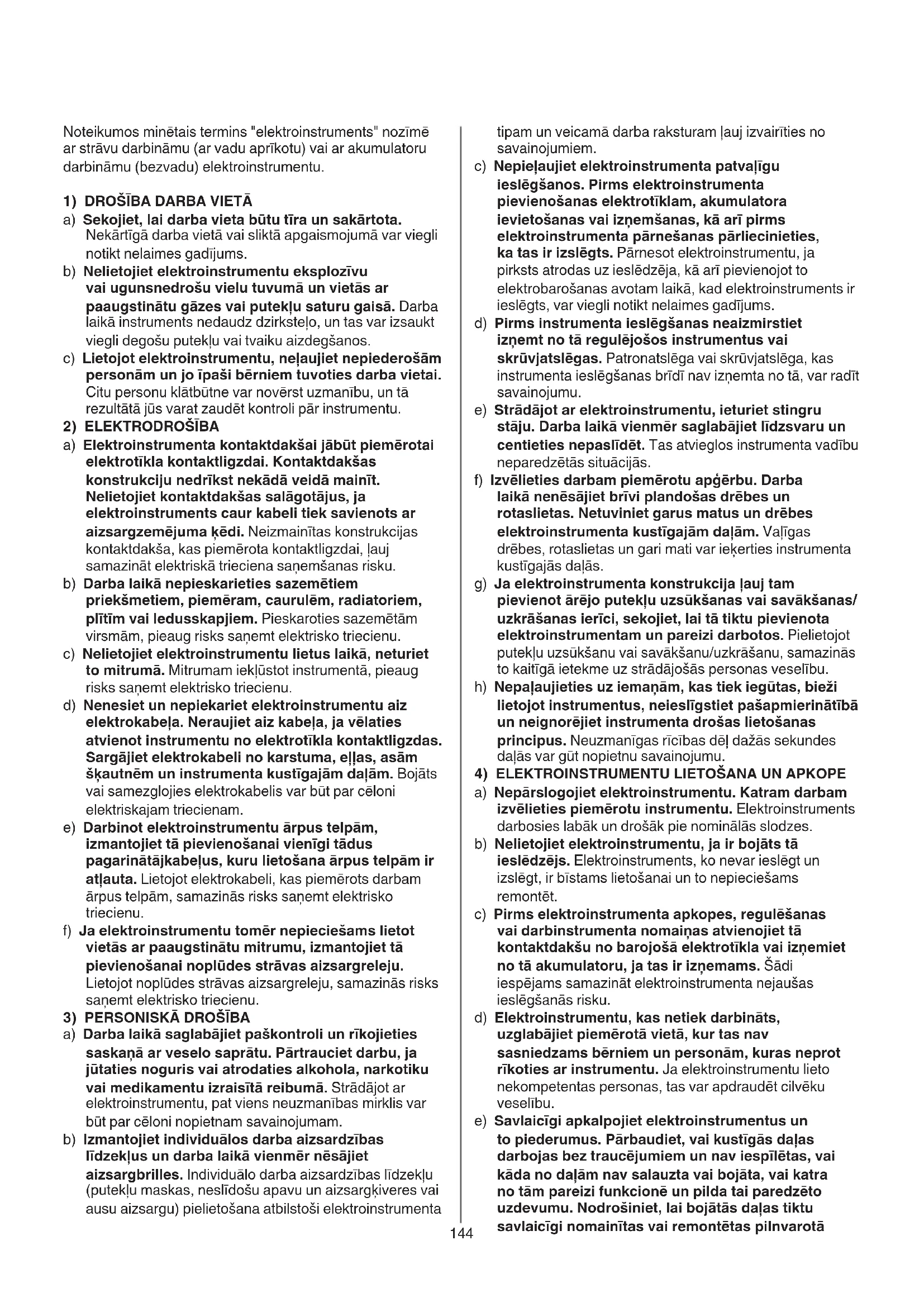 a) Nepārslogojiet elektroinstrumentu. Katram darbam izvēlieties piemērotu instrumentu. Elektroinstruments darbosies labāk un drošāk pie nominālās slodzes. b) Nelietojiet elektroinstrumentu, ja ir bojāts tā ieslēdzējs. Elektroinstruments, ko nevar ieslēgt un izslēgt, ir bīstams lietošanai un to nepieciešams remontēt. c) Pirms elektroinstrumenta apkopes, regulēšanas vai darbinstrumenta nomaiņas atvienojiet tā kontaktdakšu no barojošā elektrotīkla vai izņemiet no tā akumulatoru, ja tas ir izņemams. Šādi iespējams samazināt elektroinstrumenta nejaušas ieslēgšanās risku. d) Elektroinstrumentu, kas netiek darbināts, uzglabājiet piemērotā vietā, kur tas nav sasniedzams bērniem un personām, kuras neprot rīkoties ar instrumentu. Ja elektroinstrumentu lieto nekompetentas personas, tas var apdraudēt cilvēku veselību. e) Savlaicīgi apkalpojiet elektroinstrumentus un to piederumus. Pārbaudiet, vai kustīgās daļas darbojas bez traucējumiem un nav iespīlētas, vai kāda no daļām nav salauzta vai bojāta, vai katra no tām pareizi funkcionē un pilda tai paredzēto uzdevumu. Nodrošiniet, lai bojātās daļas tiktu savlaicīgi nomainītas vai remontētas pilnvarotā Noteikumos minētais termins "elektroinstruments" nozīmē ar strāvu darbināmu (ar vadu aprīkotu) vai ar akumulatoru darbināmu (bezvadu) elektroinstrumentu.