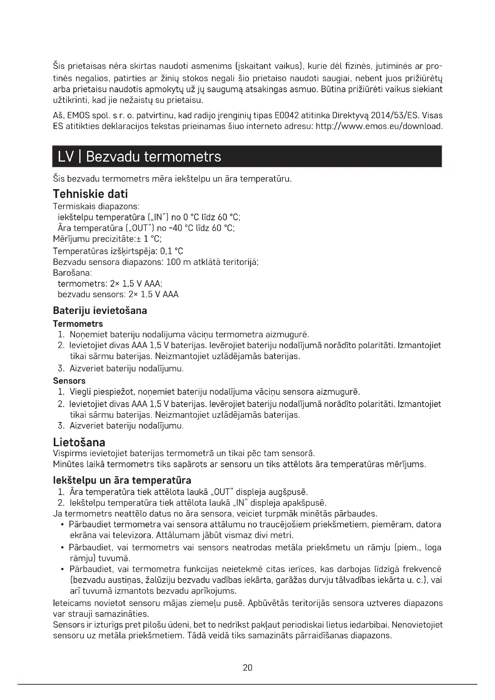 - Nemetiet baterijas ugunī, neizjauciet tās un neslēdziet tās īsslēgumā. Šo ierīci nav atļauts lietot personām (tostarp bērniem) ar ierobežotām ziskajām, maņu vai garīgajām spējām vai personām, kurām trūkst pieredzes vai zināšanu, kas var nodrošināt drošu ierīces lietošanu, ja vien par šo personu drošību atbildīgā persona nenodrošina uzraudzību vai nesniedz norādes par ierīces drošu lietošanu. Nepieciešams nodrošināt bērnu uzraudzību, lai nepieļautu rotaļāšanos ar ierīci. Ar šo EMOS spol. s r. o. deklarē, ka radioiekārta E0042 atbilst Direktīvai 2014/53/ES. Pilns ES atbilstības deklarācijas teksts ir pieejams šādā interneta vietnē: http://www.emos.eu/download. EE | Juhtmeta termomeeter Juhtmeta termomeetriga on võimalik mõõta sise- ja välistemperatuuri. Tehnilised näitajad Soojusvahemik Sisetemperatuur (SEES) 0 °C kuni 60 °C Välistemperatuur (VÄLJAS) -40 °C kuni 60 °C Mõõtmistäpsus ±1 °C Soojuseraldus: 0,1 °C Juhtmeta anduri ulatus: 100 m vabas ruumis. Toide: Termomeeter 2 × 1,5 V AAA Juhtmeta andur 2 × 1,5 V AAA Patarei paigaldamine Termomeeter