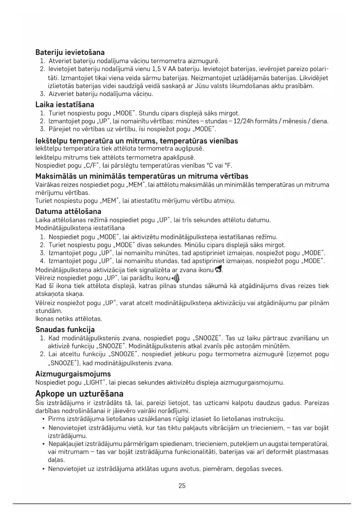 „SNOOZE”), kad modinātājpulkstenis zvana. Aizmugurgaismojums Nospiediet pogu „LIGHT”, lai piecas sekundes aktivizētu displeja aizmugurgaismojumu. Apkope un uzturēšana Šis izstrādājums ir izstrādāts tā, lai, pareizi lietojot, tas uzticami kalpotu daudzus gadus. Pareizas darbības nodrošināšanai ir jāievēro vairāki norādījumi.