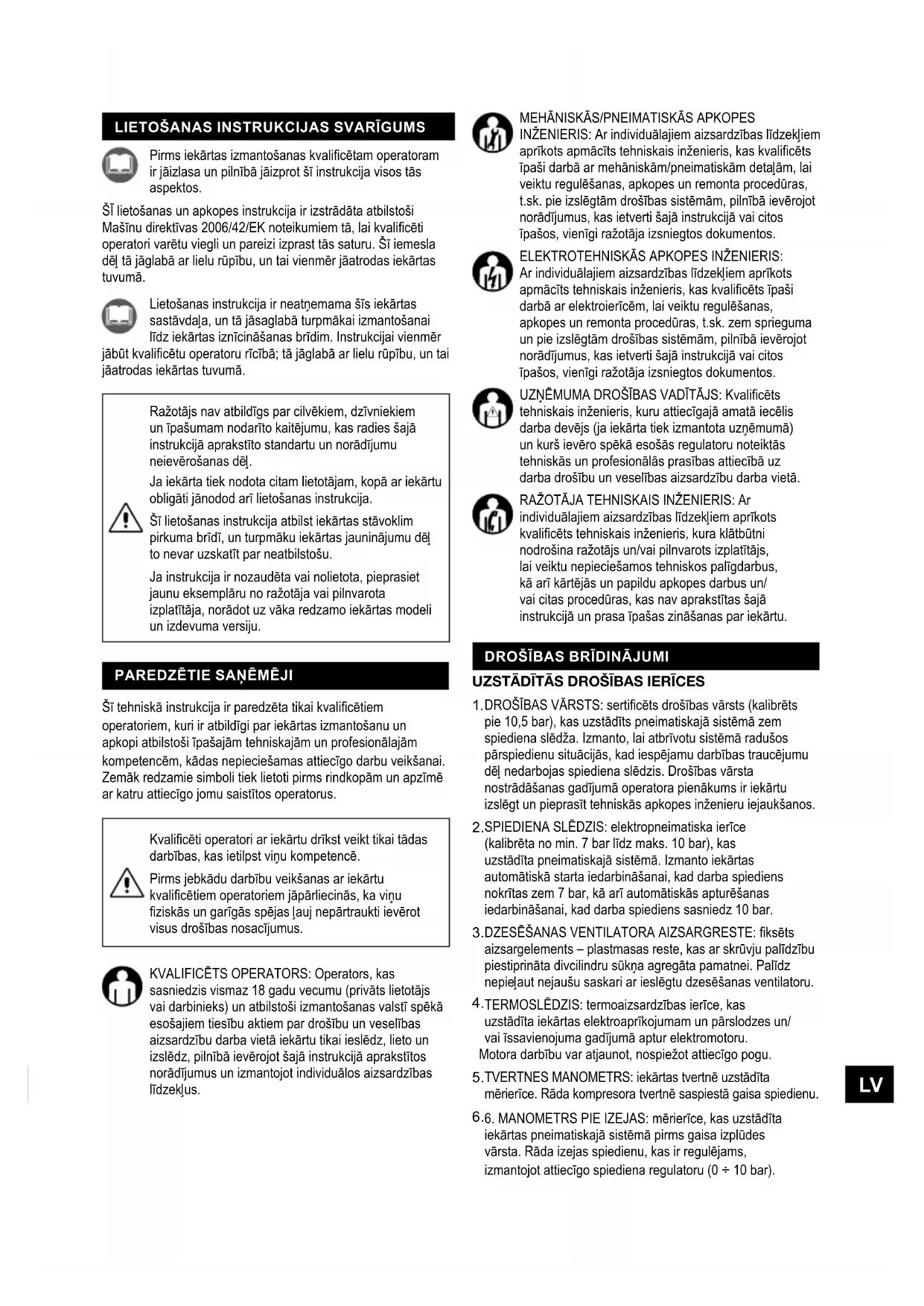 INŽENIERIS: Ar individuālajiem aizsardzības līdzekļiem aprīkots apmācīts tehniskais inženieris, kas kvalicēts īpaši darbā ar mehāniskām/pneimatiskām detaļām, lai veiktu regulēšanas, apkopes un remonta procedūras, t.sk. pie izslēgtām drošības sistēmām, pilnībā ievērojot norādījumus, kas ietverti šajā instrukcijā vai citos īpašos, vienīgi ražotāja izsniegtos dokumentos. ELEKTROTEHNISKĀS APKOPES INŽENIERIS: Ar individuālajiem aizsardzības līdzekļiem aprīkots apmācīts tehniskais inženieris, kas kvalicēts īpaši darbā ar elektroierīcēm, lai veiktu regulēšanas, apkopes un remonta procedūras, t.sk. zem sprieguma un pie izslēgtām drošības sistēmām, pilnībā ievērojot norādījumus, kas ietverti šajā instrukcijā vai citos īpašos, vienīgi ražotāja izsniegtos dokumentos. UZŅĒMUMA DROŠĪBAS VADĪTĀJS: Kvalicēts tehniskais inženieris, kuru attiecīgajā amatā iecēlis darba devējs (ja iekārta tiek izmantota uzņēmumā) un kurš ievēro spēkā esošās regulatoru noteiktās tehniskās un profesionālās prasības attiecībā uz darba drošību un veselības aizsardzību darba vietā. RAŽOTĀJA TEHNISKAIS INŽENIERIS: Ar individuālajiem aizsardzības līdzekļiem aprīkots kvalicēts tehniskais inženieris, kura klātbūtni nodrošina ražotājs un/vai pilnvarots izplatītājs, lai veiktu nepieciešamos tehniskos palīgdarbus, kā arī kārtējās un papildu apkopes darbus un/ vai citas procedūras, kas nav aprakstītas šajā instrukcijā un prasa īpašas zināšanas par iekārtu. Lietošanas instrukcija ir neatņemama šīs iekārtas sastāvdaļa, un tā jāsaglabā turpmākai izmantošanai līdz iekārtas iznīcināšanas brīdim. Instrukcijai vienmēr jābūt kvalicētu operatoru rīcībā; tā jāglabā ar lielu rūpību, un tai jāatrodas iekārtas tuvumā. Pirms iekārtas izmantošanas kvalicētam operatoram ir jāizlasa un pilnībā jāizprot šī instrukcija visos tās aspektos. ŠĪ lietošanas un apkopes instrukcija ir izstrādāta atbilstoši Mašīnu direktīvas 2006/42/EK noteikumiem tā, lai kvalicēti operatori varētu viegli un pareizi izprast tās saturu. Šī iemesla dēļ tā jāglabā ar lielu rūpību, un tai vienmēr jāatrodas iekārtas tuvumā.