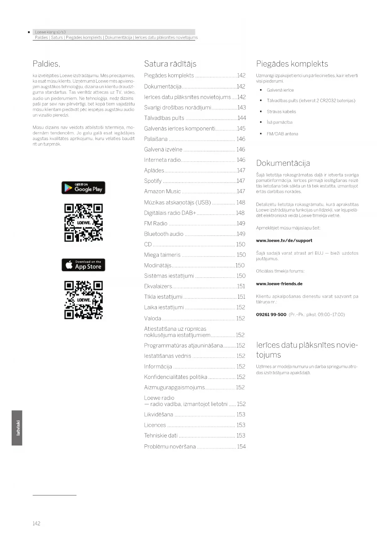 - Problēmu novēršana Piegādes komplekts Uzmanīgi izpakojiet ierīci un pārliecinieties, ka ir ietverti visi piederumi. Galvenā ierīce Tālvadības pults (ietverot 2 CR2032 baterijas) Strāvas kabelis Īsā pamācība FM/DAB antena Dokumentācija Šajā lietotāja rokasgrāmatas daļā ir ietverta svarīga pamatinformācija. Ierīces pirmajā ieslēgšanas reizē tās lietošana tiek sākta un tā tiek iestatīta, izmantojot ērtās darbības norādes. Detalizētu lietotāja rokasgrāmatu, kurā aprakstītas Loewe izstrādājuma funkcijas un līdzekļi, var lejupielā- dēt elektroniskā veidā Loewe tīmekļa vietnē. Apmeklējiet mūsu mājaslapu šeit: www.loewe.tv/de/support Šajā sadaļā varat atrast arī BUJ — bieži uzdotos jautājumus. Oficiālais tīmekļa forums: www.loewe-friends.de Klientu apkalpošanas dienestu varat sazvanīt pa tālruņa nr.: 09261 99-500 (Pr.–Pk.: plkst. 09:00–17:00) Ierīces datu plāksnītes novie- tojums Uzlīmes ar modeļa numuru un darba spriegumu atro- das izstrādājuma apakšdaļā.143 p. 154