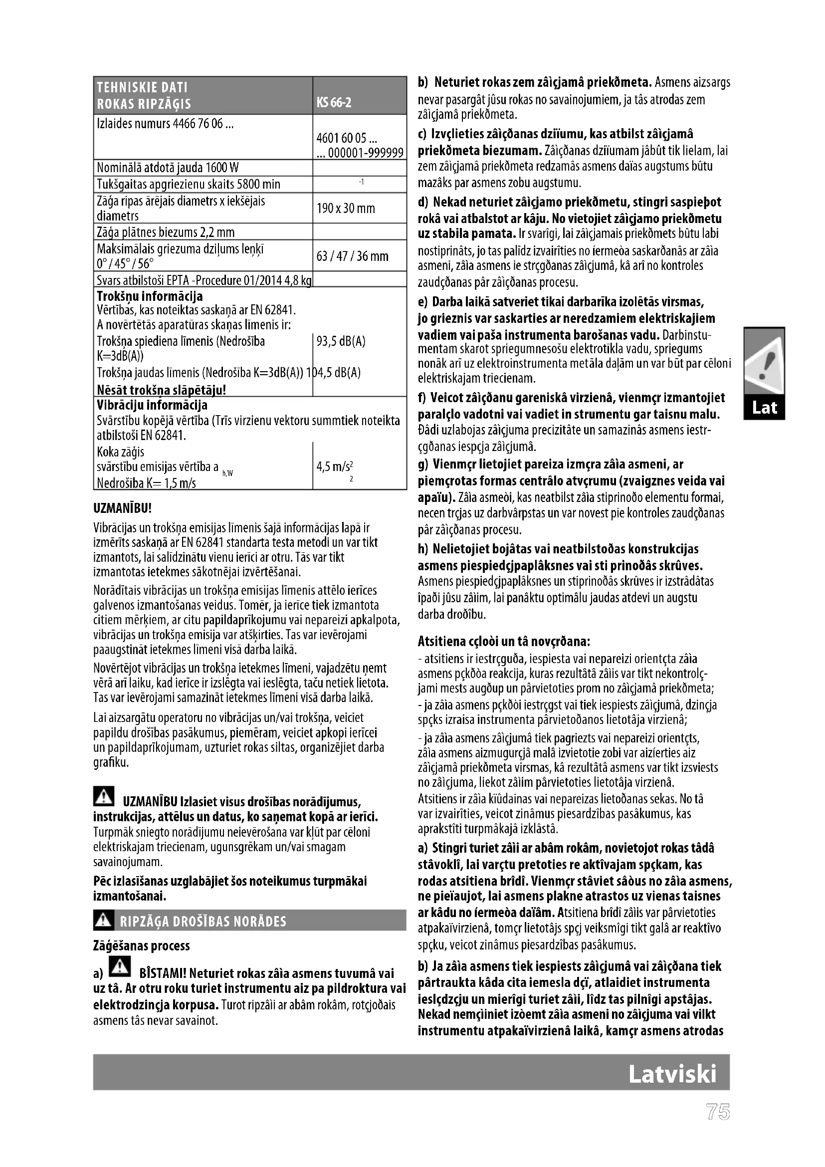 UZMANĪBU! Vibrācijas un trokšņa emisijas līmenis šajā informācijas lapā ir izmērīts saskaņā ar EN 62841 standarta testa metodi un var tikt izmantots, lai salīdzinātu vienu ierīci ar otru. Tās var tikt izmantotas ietekmes sākotnējai izvērtēšanai. Norādītais vibrācijas un trokšņa emisijas līmenis attēlo ierīces galvenos izmantošanas veidus. Tomēr, ja ierīce tiek izmantota citiem mērķiem, ar citu papildaprīkojumu vai nepareizi apkalpota, vibrācijas un trokšņa emisija var atšķirties. Tas var ievērojami paaugstināt ietekmes līmeni visā darba laikā. Novērtējot vibrācijas un trokšņa ietekmes līmeni, vajadzētu ņemt vērā arī laiku, kad ierīce ir izslēgta vai ieslēgta, taču netiek lietota. Tas var ievērojami samazināt ietekmes līmeni visā darba laikā. Lai aizsargātu operatoru no vibrācijas un/vai trokšņa, veiciet papildu drošības pasākumus, piemēram, veiciet apkopi ierīcei un papildaprīkojumam, uzturiet rokas siltas, organizējiet darba graku. UZMANĪBU Izlasiet visus drošības norādījumus, instrukcijas, attēlus un datus, ko saņemat kopā ar ierīci. Turpmāk sniegto norādījumu neievērošana var kļūt par cēloni elektriskajam triecienam, ugunsgrēkam un/vai smagam savainojumam. Pēc izlasīšanas uzglabājiet šos noteikumus turpmākai izmantošanai.