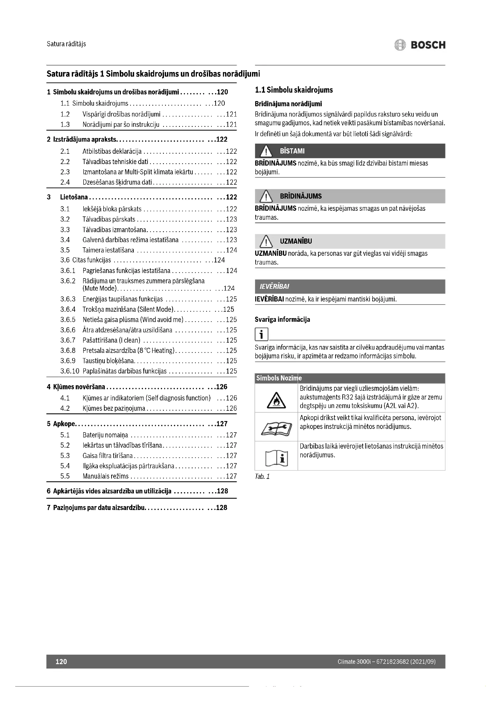 IEVĒRĪBAI nozīmē, ka ir iespējami mantiski bojājumi. Svarīga informācija Svarīga informācija, kas nav saistīta ar cilvēku apdraudējumu vai mantas bojājuma risku, ir apzīmēta ar redzamo informācijas simbolu. Tab. 1 1 Simbolu skaidrojums un drošības norādījumi . . . . . . . . . . .120