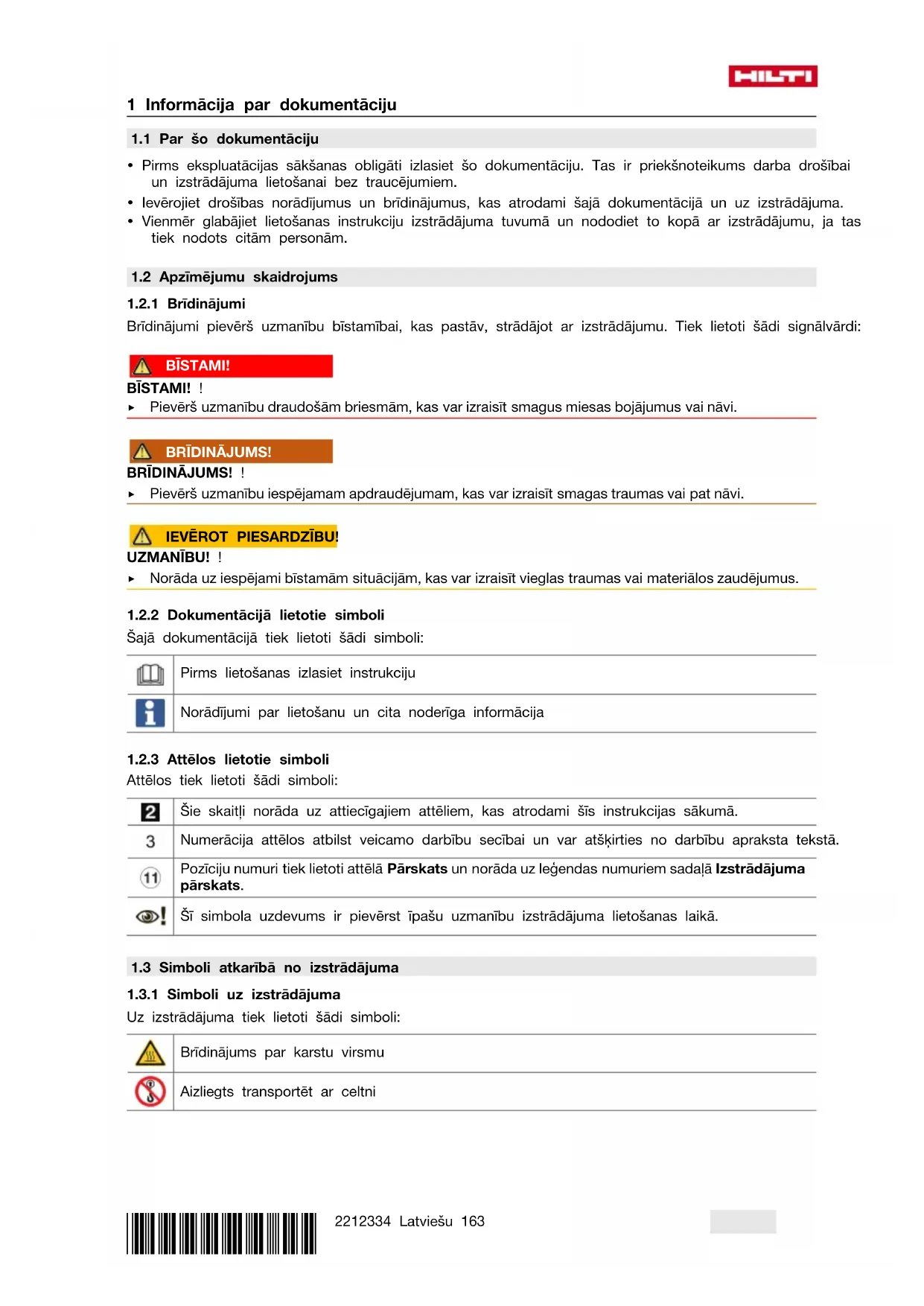 Uzņemoties pilnu atbildību, mēs apliecinām, ka šeit aprakstītais izstrādājums atbilst šādām direktīvām un standartiem: Atbilstības deklarācijas attēls ir atrodams šīs dokumentācijas beigās. Tehniskā dokumentācija ir saglabāta šeit: Hilti Entwicklungsgesellschaft mbH | Zulassung Geräte | Hiltistraße 6 | 86916 Kaufering, DE 2 Drošība