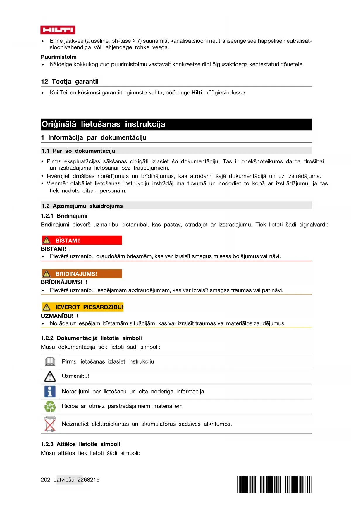 - Lappuse 213. 11 Nokalpojušo iekārtu utilizācija Hilti izstrādājumu izgatavošanā tiek izmantoti galvenokārt otrreiz pārstrādājami materiāli. Priekšnosacī- jums otrreizējai pārstrādei ir atbilstoša materiālu šķirošana. Daudzās valstīs Hilti pieņem nolietotās iekārtas otrreizējai pārstrādei. Lai saņemtu vairāk informācijas, vērsieties Hilti servisā vai pie sava pārdošanas kon- sultanta. Saskaņā ar Eiropas Direktīvu par nokalpojušām elektroiekārtām un elektroniskām ierīcēm un tās īstenošanai paredzētajām nacionālajām normām nolietotās elektroiekārtas jāsavāc atsevišķi un jānodod utilizācijai saskaņā ar vides aizsardzības prasībām. ▶ Neizmetiet elektroiekārtas sadzīves atkritumos! Urbšanas suspensija Ņemot vērā vides aizsardzības aspektus, urbšanas radīto duļķu tieša ieplūšana ūdenskrātuvēs vai kanalizācijā bez atbilstošas iepriekšējas apstrādes nav vēlama. ▶ Informāciju par spēkā esošajiem noteikumiem Jūs varat saņemt no vietējās varas institūcijām. Mēs iesakām šādu iepriekšēju apstrādi: ▶ Savāciet urbšanas duļķes (piemēram, ar šķidruma nosūcēja palīdzību). ▶ Ļaujiet duļķēm nogulsnēties un utilizējiet nogulšņu cieto daļu būvgružu izgāztuvē (koagulanti var paātrināt atdalīšanas procesu). ▶ Pirms atlikušā ūdens (sārmains, ph vērtība > 7) novadīšanas kanalizācijā tas jāneitralizē, pievienojot skābu neitralizācijas līdzekli vai atšķaidot ar lielu ūdens daudzumu. Urbšanas putekļi ▶ Utilizējiet savāktos urbšanas putekļus saskaņā ar spēkā esošo nacionālo tiesību aktu prasībām.*2268215* 2268215 Lietuvių 219 12 Ražotāja garantija ▶ Ar jautājumiem par garantijas nosacījumiem, lūdzu, vērsieties pie vietējā Hilti partnera. Originali naudojimo instrukcija 1 Dokumentų duomenys