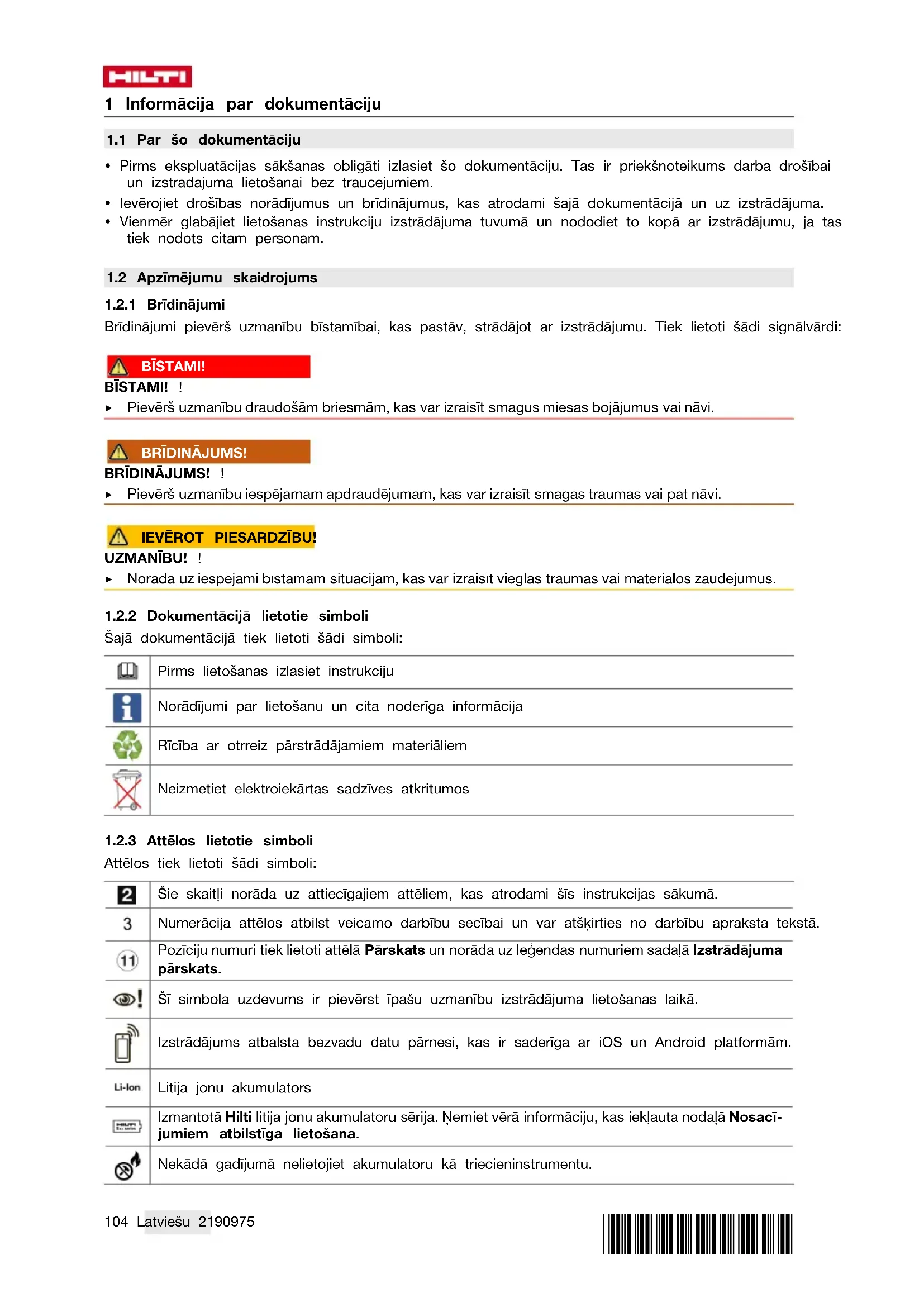 Attēlos tiek lietoti šādi simboli: Šie skaitļi norāda uz attiecīgajiem attēliem, kas atrodami šīs instrukcijas sākumā. Numerācija attēlos atbilst veicamo darbību secībai un var atšķirties no darbību apraksta tekstā. Pozīciju numuri tiek lietoti attēlā Pārskats un norāda uz leģendas numuriem sadaļā Izstrādājuma pārskats. Šī simbola uzdevums ir pievērst īpašu uzmanību izstrādājuma lietošanas laikā. Izstrādājums atbalsta bezvadu datu pārnesi, kas ir saderīga ar iOS un Android platformām. Litija jonu akumulators Izmantotā Hilti litija jonu akumulatoru sērija. Ņemiet vērā informāciju, kas iekļauta nodaļā Nosacī- jumiem atbilstīga lietošana. Nekādā gadījumā nelietojiet akumulatoru kā triecieninstrumentu.*2190975* 2190975 Latviešu 105 Sargājiet akumulatoru no kritieniem. Nelietojiet akumulatoru, ja tas ir bijis pakļauts triecienam vai tam ir radušies cita veida bojājumi.