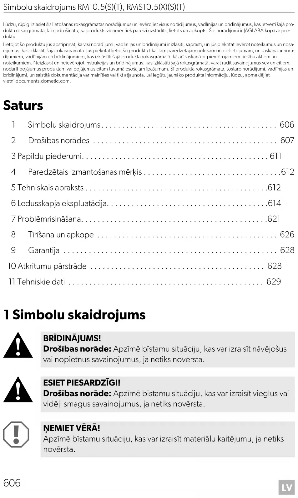 - Lūdzu, rūpīgi izlasiet šīs lietošanas rokasgrāmatas norādījumus un ievērojiet visus norādījumus, vadlīnijas un brīdinājumus, kas ietverti šajā pro- dukta rokasgrāmatā, lai nodrošinātu, ka produkts vienmēr tiek pareizi uzstādīts, lietots un apkopts. Šie norādījumi ir JĀGLABĀ kopā ar pro- duktu. Lietojot šo produktu jūs apstiprināt, ka visi norādījumi, vadlīnijas un brīdinājumi ir izlasīti, saprasti, un jūs piekrītat ievērot noteikumus un nosa- cījumus, kas izklāstīti šajā rokasgrāmatā. Jūs piekrītat lietot šo produktu tikai tam paredzētajam nolūkam un pielietojumam, un saskaņā ar norā- dījumiem, vadlīnijām un brīdinājumiem, kas izklāstīti šajā produkta rokasgrāmatā, kā arī saskaņā ar piemērojamiem tiesību aktiem un noteikumiem. Neizlasot un neievērojot instrukcijas un brīdinājumus, kas izklāstīti šajā rokasgrāmatā, varat radīt savainojumus sev un citiem, nodarīt bojājumus produktam vai bojājumus citam tuvumā esošajam īpašumam. Šī produkta rokasgrāmata, tostarp norādījumi, vadlīnijas un brīdinājumi, un saistītā dokumentācija var mainīties vai tikt atjaunota. Lai iegūtu jaunāko produkta informāciju, lūdzu, apmeklējiet vietni documents.dometic.com. Saturs 1 Simbolu skaidrojums p. 606