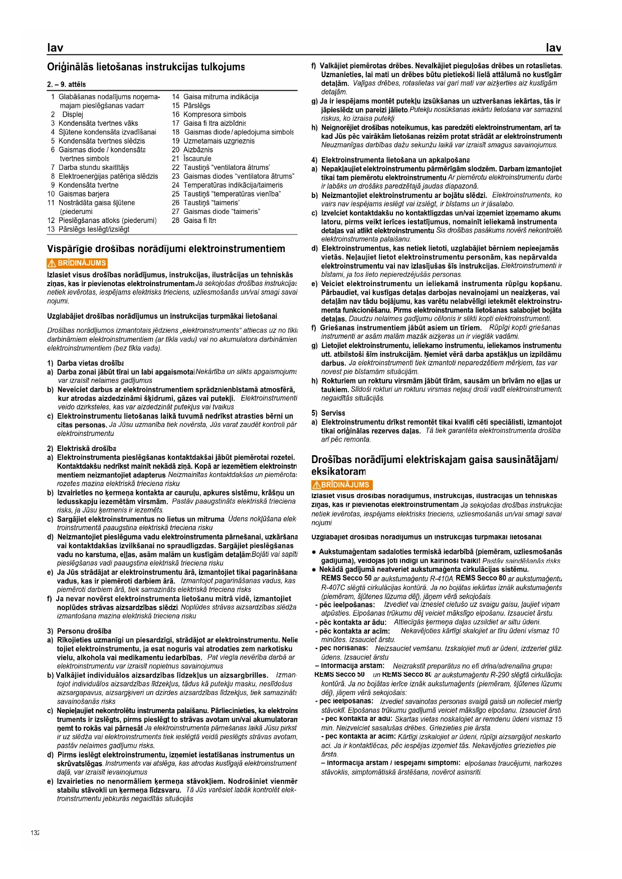 Nekādā gadījumā neatveriet aukstumaģenta cirkulācijas sistēmu. REMS Secco 50 ar aukstumaģentu R-410A, REMS Secco 80 ar aukstumaģentu R-407C slēgtā cirkulācijas kontūrā. Ja no bojātas iekārtas iznāk aukstumaģents (piemēram, šļūtenes lūzuma dēļ), jāņem vērā sekojošais: - pēc ieelpošanas: Izvediet vai iznesiet cietušo uz svaigu gaisu, ļaujiet viņam atpūsties. Elpošanas trūkumu dēļ veiciet mākslīgo elpošanu. Izsauciet ārstu. - pēc kontakta ar ādu: Attiecīgās ķermeņa daļas uzsildiet ar siltu ūdeni. - pēc kontakta ar acīm: Nekavējoties kārtīgi skalojiet ar tīru ūdeni vismaz 10 minūtes. Izsauciet ārstu. - pēc norīšanas: Neizsauciet vemšanu. Izskalojiet muti ar ūdeni, izdzeriet glāzi ūdens. Izsauciet ārstu. – Informācija ārstam: Neizrakstīt preparātus no efi drīna/adrenalīna grupas. REMS Secco 50