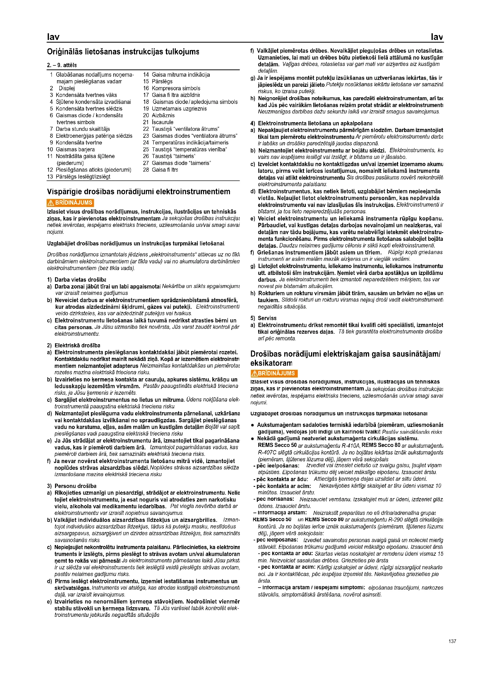 a) Elektroinstrumentu drīkst remontēt tikai kvalifi cēti speciālisti, izmantojot tikai oriģinālas rezerves daļas. Tā tiek garantēta elektroinstrumenta drošība arī pēc remonta. Drošības norādījumi elektriskajam gaisa sausinātājam/ eksikatoram