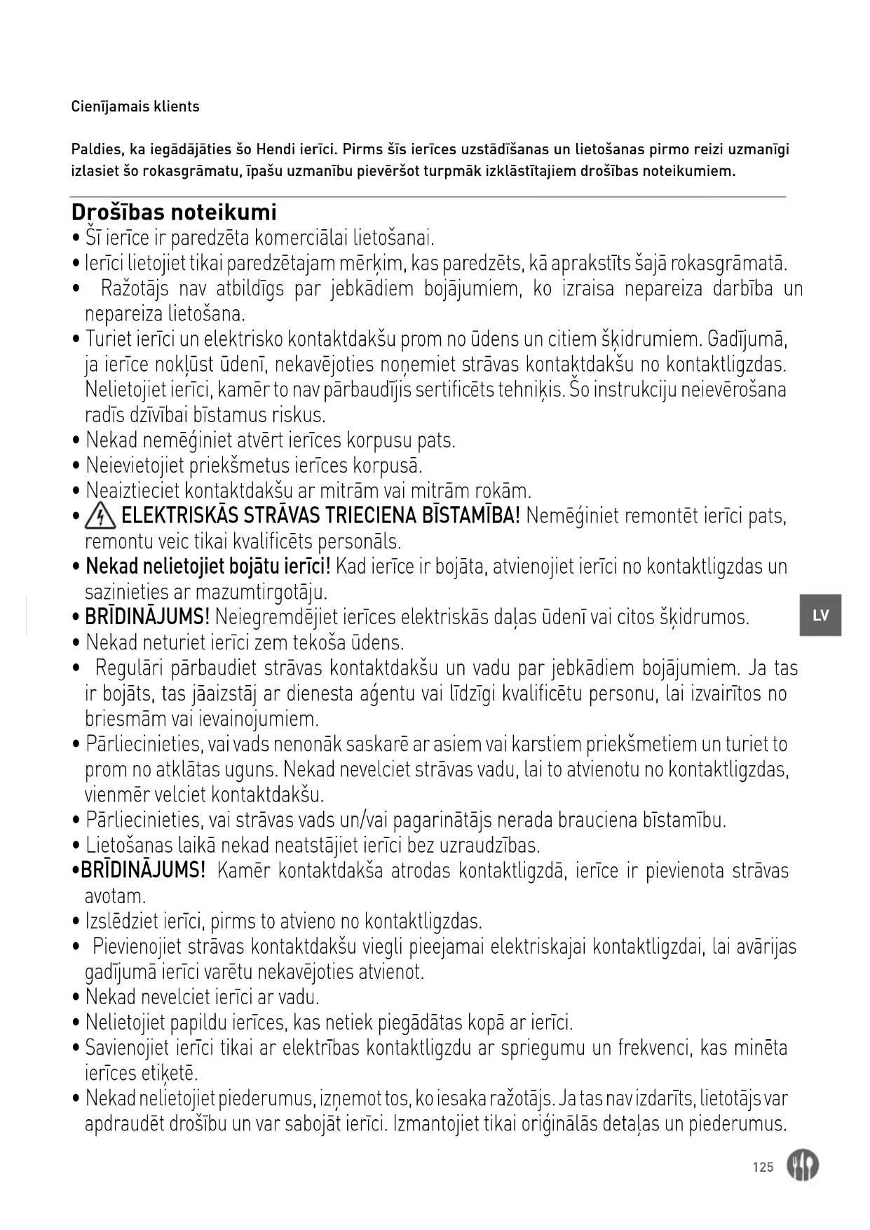 - Šo ierīci drīkst izmantot un uzstādīt tikai specializēti apmācīts personāls, kas strādā pārtikas rūpniecības virtuvē, piemēram, ēdināšanas uzņēmumi, restorāni, bāri utt.