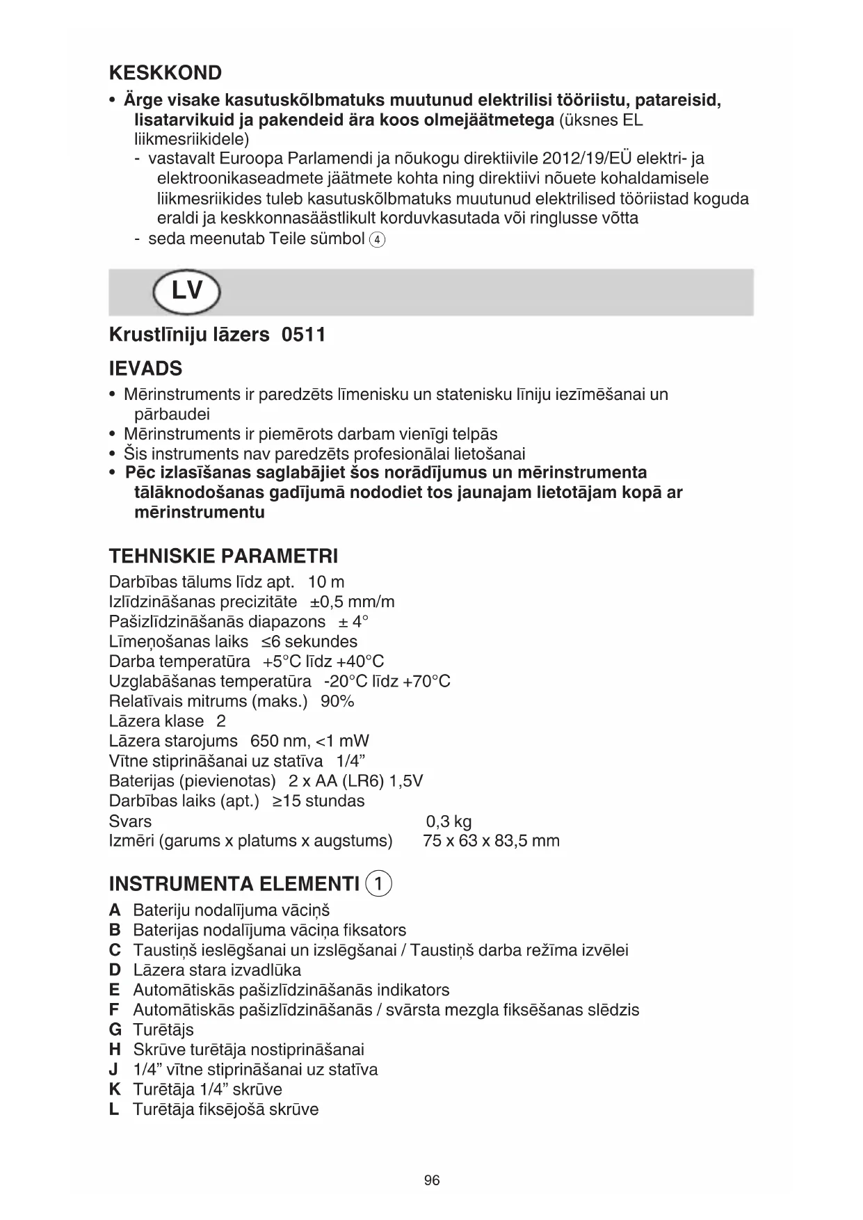 - Pēcizlasīšanassaglabājietšosnorādījumusunmērinstrumenta tālāknodošanasgadījumānododiettosjaunajamlietotājamkopāar mērinstrumentu TEHNISKIE PARAMETRI Darbības tālums līdz apt. 10 m Izlīdzināšanas precizitāte ±0,5 mm/m Pašizlīdzināšanās diapazons ± 4° Līmeņošanas laiks ≥6 sekundes Darba temperatūra +5°C līdz +40°C Uzglabāšanas temperatūra -20°C līdz +70°C Relatīvais mitrums (maks.) 90% Lāzera klase 2 Lāzera starojums 650 nm, <1 mW Vītne stiprināšanai uz statīva 1/4” Baterijas (pievienotas) 2 x AA (LR6) 1,5V Darbības laiks (apt.) ≤15 stundas Svars 0,3 kg Izmēri (garums x platums x augstums) 75 x 63 x 83,5 mm INSTRUMENTA ELEMENTI 1 A Bateriju nodalījuma vāciņš B Baterijas nodalījuma vāciņa fiksators C Taustiņš ieslēgšanai un izslēgšanai / Taustiņš darba režīma izvēlei D Lāzera stara izvadlūka E Automātiskās pašizlīdzināšanās indikators F Automātiskās pašizlīdzināšanās / svārsta mezgla fiksēšanas slēdzis G Turētājs H Skrūve turētāja nostiprināšanai J 1/4” vītne stiprināšanai uz statīva K Turētāja 1/4” skrūve L Turētāja fiksējošā skrūve97 M Lāzera skatbrilles* N Statīvs*