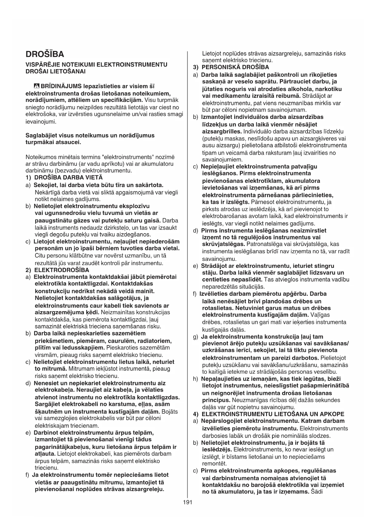 - BRĪDINĀJUMS Iepazīstieties ar visiem šī elektroinstrumenta drošas lietošanas noteikumiem, norādījumiem, attēliem un specikācijām. Visu turpmāk sniegto norādījumu neizpildes rezultātā lietotājs var ciest no elektrošoka, var izvērsties ugunsnelaime un/vai rasties smagi ievainojumi. Saglabājiet visus noteikumus un norādījumus turpmākai atsaucei. Noteikumos minētais termins "elektroinstruments" nozīmē ar strāvu darbināmu (ar vadu aprīkotu) vai ar akumulatoru darbināmu (bezvadu) elektroinstrumentu.