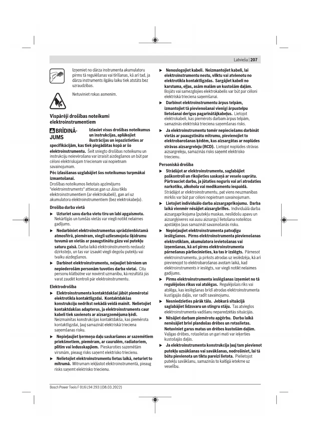 Norādītās radītās vibrācijas un trokšņa vērtības ir izmērītas saskaņā ar standartizētu pārbaužu metodi un var tikt izmantotas, lai savā starpā salīdzinātu elektroinstrumentus. Tās, ka norādīto kopējo vibrācijas vērtību un norādīto radītā trokšņa vērtību, var izmantot arī sākotnējai iedarbības izvērtēšanai. Tā kā elektroinstrumenta faktiskās lietošanas laikā radušās vibrācijas un trokšņa faktiskās vērtības ir atkarīgas no elektroinstrumenta lietošanas veida un jo īpaši no priekšmeta apstrādes veida un var atšķirties no norādītajām vērtībām, ir nepieciešams noteikt atbilstošus drošības pasākumus lietotāja aizsardzībai, pamatojoties uz vibrācijas iedarbības novērtējumu faktiskajos lietošanas apstākļos (pie tam jāņem vērā visas elektroinstrumenta darbības cikla daļas, piemēram, laika posmi, kad tas ir izslēgts, kā arī laika posmi, kad tas darbojas bez slodzes). Uzsākot lietošanu Jūsu drošībai u Ievērībai! Pirms iestatīšanas vai tīrīšanas darbiem izslēdziet dārza instrumentu un izņemiet no tā akumulatoru. u Pēc dzīvžoga šķēru izslēgšanas to griezējasmens vēl dažas sekundes daļas turpina kustēties. u Nepieskarieties kustīgajam griezējasmenim. Akumulatora uzlādes ierīce u Pievadiet izstrādājumam pareizu elektrotīkla spriegumu! Spriegumam barojošajā elektrotīklā jāatbilst uzlādes ierīces marķējuma plāksnītē norādītajai sprieguma vērtībai. Akumulators ir apgādāts ar temperatūras kontroles ierīci, kas pieļauj uzlādi vienīgi temperatūras vērtību diapazonā no 0 °C līdz 35 °C. Tas ļauj panākt lielu akumulatora kalpošanas laiku. Norāde: Akumulators tiek piegādāts daļēji uzlādētā stāvoklī. Lai akumulators spētu nodrošināt pilnu jaudu, tas pirms pirmās lietošanas pilnīgi jāuzlādē uzlādes ierīcē. Litija-jonu akumulatoru var uzlādēt jebkurā laikā, nebaidoties samazināt tā kalpošanas laiku. Akumulatoram nekaitē arī pārtraukums uzlādes procesā. Pateicoties elektroniskajai elementu aizsardzībai „Electronic Cell Protection (ECP)“, litija-jonu akumulatori tiek aizsargāti pret dziļo izlādi. Ja akumulators ir izlādēts, aizsardzības ierīce izslēdz izstrādājumu: Šādā gadījumā dārza instruments vairs nedarbojas. Ja izstrādājums ir automātiski izslēdzies, nemēģiniet to no jauna ieslēgt, nospiežot ieslēdzēju. Tas var sabojāt akumulatoru. Bosch Power Tools F 016 L94 293 | (08.03.2022)212 | Latviešu Ievērojiet norādījumus par atbrīvošanos no nolietotajiem akumulatoriem. Akumulatora ievietošana un izņemšana (attēls