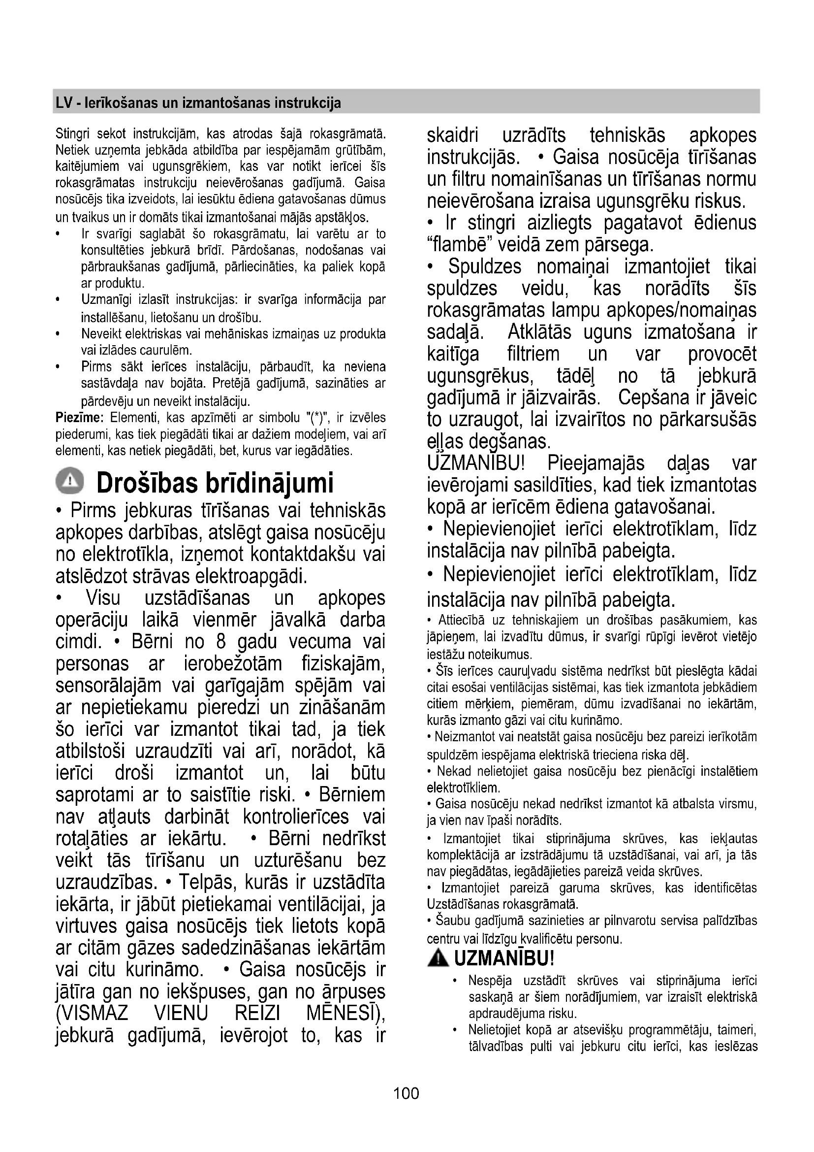 - Nekad nelietojiet gaisa nosūcē ju bez pienācīgi instalētiem elektrotīkliem.