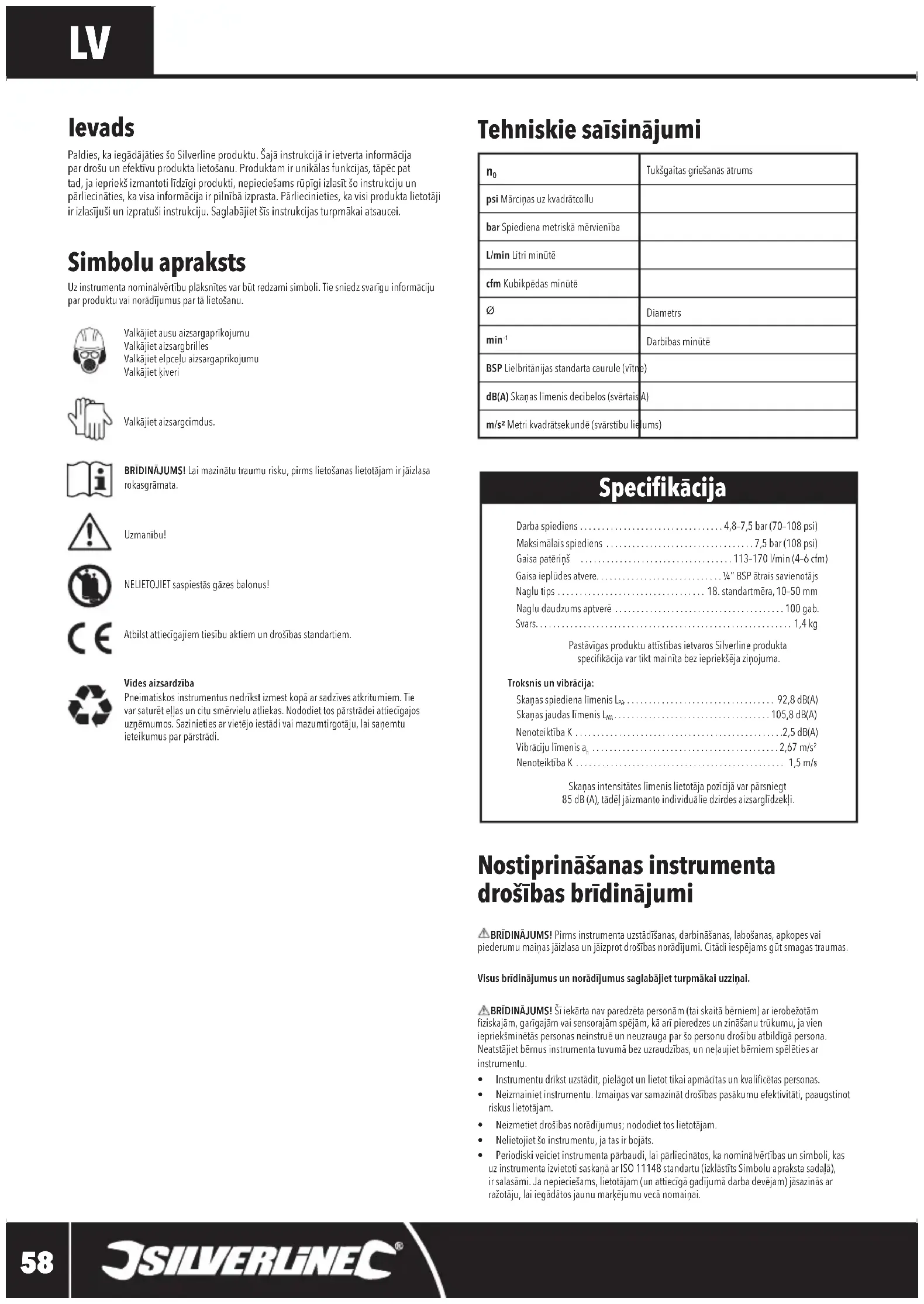 Darbaspiediens .................................4,8–7,5bar(70–108psi) Maksimālaisspiediens ..................................7,5bar(108psi) Gaisapatēriņš ...................................113–170l/min(4–6cfm) Gaisaieplūdesatvere.............................¼’’BSPātraissavienotājs Naglu tips ..................................18.standartmēra,10–50mm Nagludaudzumsaptverē .......................................100gab. Svars...........................................................1,4kg PastāvīgasproduktuattīstībasietvarosSilverlineprodukta specikācijavartiktmainītabeziepriekšējaziņojuma. Troksnis un vibrācija: SkaņasspiedienalīmenisL ................................... 92,8dB(A) SkaņasjaudaslīmenisL ....................................105,8dB(A) NenoteiktībaK ................................................2,5dB(A) Vibrācijulīmenisa ...........................................2,67m/s NenoteiktībaK ................................................ 1,5m/s Skaņasintensitāteslīmenislietotājapozīcijāvarpārsniegt 85dB(A),tādēļjāizmantoindividuāliedzirdesaizsarglīdzekļi. Specikācija Nostiprināšanas instrumenta drošības brīdinājumi BRĪDINĀJUMS!Pirmsinstrumentauzstādīšanas,darbināšanas,labošanas,apkopesvaipiederumumaiņasjāizlasaunjāizprotdrošībasnorādījumi.Citādiiespējamsgūtsmagastraumas.Visus brīdinājumus un norādījumus saglabājiet turpmākai uzziņai. BRĪDINĀJUMS!Šīiekārtanavparedzētapersonām(taiskaitābērniem)arierobežotāmziskajām,garīgajāmvaisensorajāmspējām,kāarīpieredzesunzināšanutrūkumu,javieniepriekšminētāspersonasneinstruēunneuzraugaparšopersonudrošībuatbildīgāpersona.Neatstājietbērnusinstrumentatuvumābezuzraudzības,unneļaujietbērniemspēlētiesarinstrumentu.• Instrumentudrīkstuzstādīt,pielāgotunlietottikaiapmācītasunkvalicētaspersonas.• Neizmainietinstrumentu.Izmaiņasvarsamazinātdrošībaspasākumuefektivitāti,paaugstinotriskuslietotājam.• Neizmetietdrošībasnorādījumus;nododiettoslietotājam.• Nelietojietšoinstrumentu,jatasirbojāts.• Periodiskiveicietinstrumentapārbaudi,laipārliecinātos,kanominālvērtībasunsimboli,kasuzinstrumentaizvietotisaskaņāarISO11148standartu(izklāstītsSimboluaprakstasadaļā),irsalasāmi.Janepieciešams,lietotājam(unattiecīgāgadījumādarbadevējam)jāsazināsarražotāju,laiiegādātosjaunumarķējumuvecānomaiņai. Simbolu apraksts Uzinstrumentanominālvērtībuplāksnītesvarbūtredzamisimboli.Tiesniedzsvarīguinformācijuparproduktuvainorādījumuspartālietošanu.Valkājietausuaizsargaprīkojumu Valkājietaizsargbrilles Valkājietelpceļuaizsargaprīkojumu ValkājietķiveriValkājietaizsargcimdus.BRĪDINĀJUMS!Laimazinātutraumurisku,pirmslietošanaslietotājamirjāizlasarokasgrāmata.Uzmanību!NELIETOJIETsaspiestāsgāzesbalonus!Atbilstattiecīgajiemtiesībuaktiemundrošībasstandartiem.Vides aizsardzība Pneimatiskosinstrumentusnedrīkstizmestkopāarsadzīvesatkritumiem.Tievarsaturēteļļasuncitusmērvieluatliekas.Nododiettospārstrādeiattiecīgajosuzņēmumos.Sazinietiesarvietējoiestādivaimazumtirgotāju,laisaņemtuieteikumusparpārstrādi. Ievads Paldies,kaiegādājātiesšoSilverlineproduktu.Šajāinstrukcijāirietvertainformācijapardrošuunefektīvuproduktalietošanu.Produktamirunikālasfunkcijas,tāpēcpattad,jaiepriekšizmantotilīdzīgiprodukti,nepieciešamsrūpīgiizlasītšoinstrukcijuunpārliecināties,kavisainformācijairpilnībāizprasta.Pārliecinieties,kavisiproduktalietotājiirizlasījušiunizpratušiinstrukciju.Saglabājietšīsinstrukcijasturpmākaiatsaucei. Tehniskie saīsinājumi