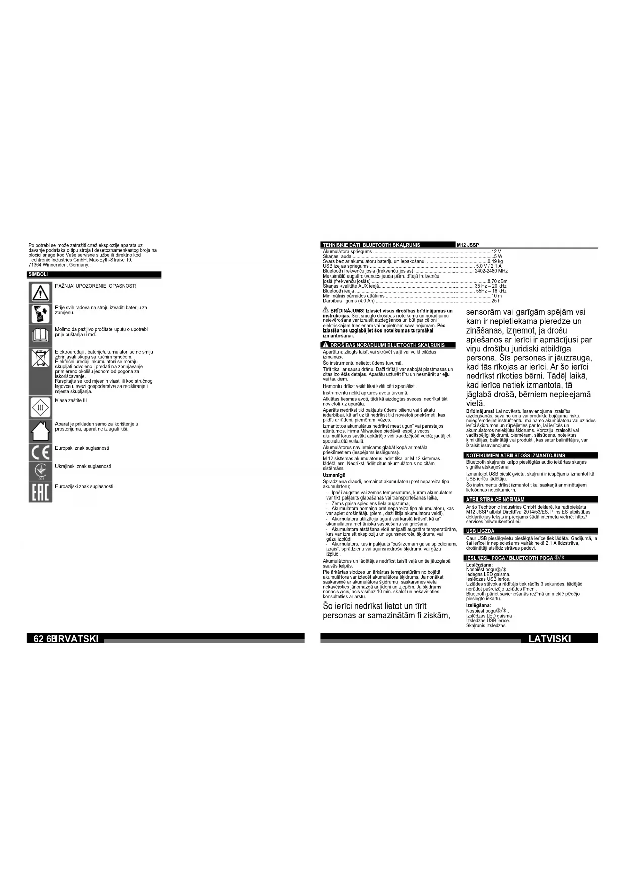 - Bojātus vai tekošus akumulatorus nedrīkst transportēt. Plašāku informāciju Jūs varat saņemt no ekspedīcijas uzņēmuma. APKOPE Izmantojiet tikai fi rmu Milwaukee piederumus un fi rmas Milwaukee rezerves daļas. Lieciet nomainīt detaļas, kuru nomaiņa nav aprakstīta, kādā no fi rmu Milwaukee klientu apkalpošanas servisiem. (Skat. brošūru "Garantija/klientu apkalpošanas serviss".) Ja nepieciešams, klientu apkalpošanas servisā vai tieši pie fi rmas Techtronic Industries GmbH, Max-Eyth-Straße 10, LATVISKI 71364 Winnenden, Germany, var pieprasīt instrumenta numurs, kas norādīts uz jaudas paneļa. SIMBOLI UZMANĪBU! BÎSTAMI! Pirms mašīnai veikt jebkāda veida apkopes darbus, ir jāizņem ārā akumulātors. Pirms sākt lietot instrumentu, lūdzu, izlasiet lietošanas pamācību. Elektriskus aparātus, baterijas/akumulatorus nedrīkst utilizēt kopā ar mājsaimniecības atkritumiem. Elektriski aparāti un akumulatori ir jāsavāc atsevišķi un jānodod atkritumu pārstrādes uzņēmumā videi saudzīgai utilizācijai. Jautājiet vietējā iestādē vai savam specializētājam tirgotājam, kur atrodas atkritumu pārstrādes uzņēmumi vai savākšanas punkti. Aizsardzības klase III Šis instruments ir piemērots tikai darbam iekštelpās. Sargāt instrumentu no lietus. Eiropas atbilstības zīme Ukrainas atbilstības zīme Eirāzijas atbilstības zīme66 67 M12 JSSP .............................12 V ...............................5 W ..........................0,49 kg ................ 5,0 V / 2,1 A ............... 2402-2480 MHz ..........................8,70 dBm ............... 35 Hz – 20 kHz ................ 55Hz – 16 kHz .............................10 m .............................25 h LIETUVIŠKAI