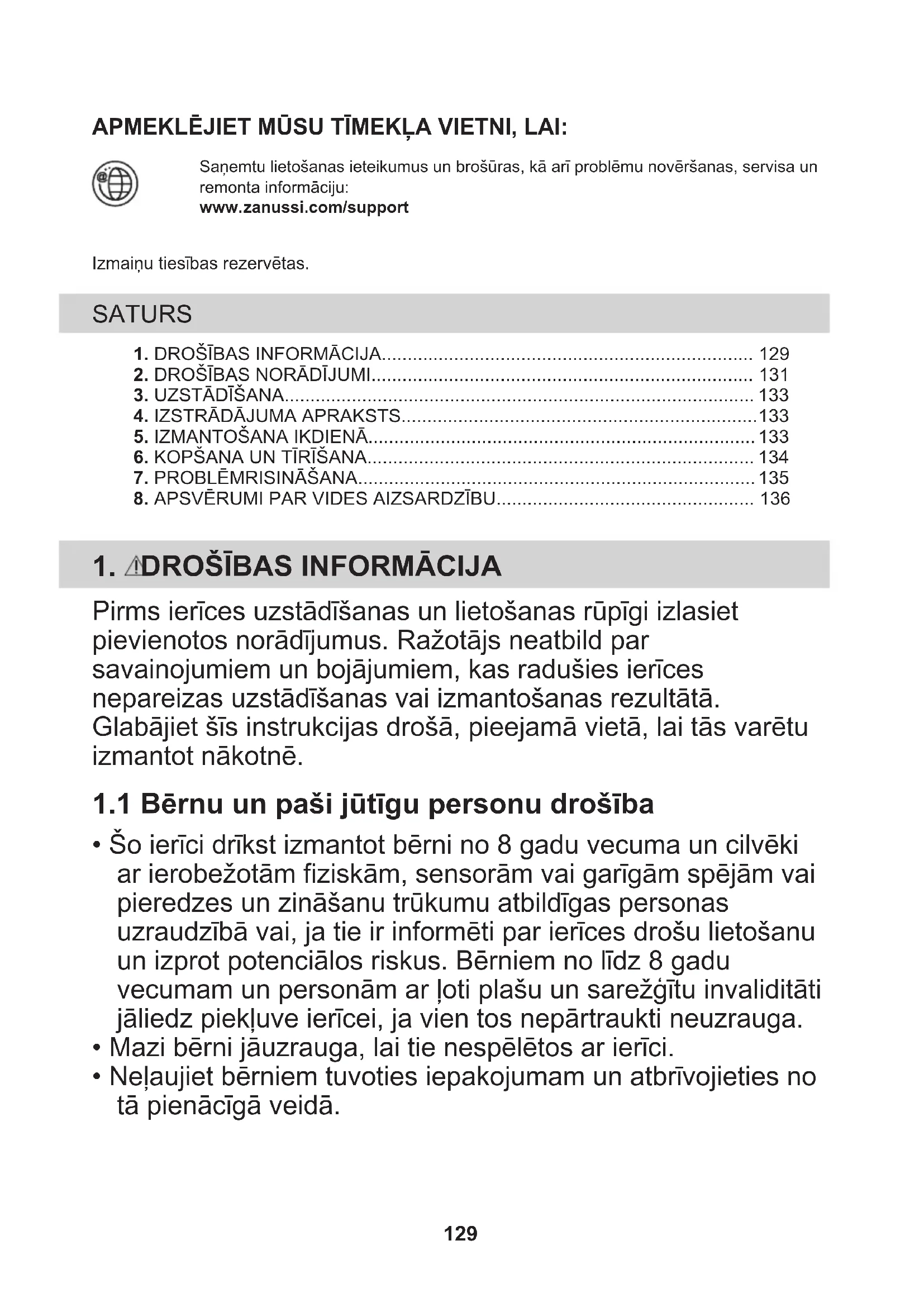 Nododiet otrreizējai pārstrādei materiālus ar simbolu . Ievietojiet iepakojuma materiālus atbilstošajos konteineros to otrreizējai pārstrādei. Palīdziet aizsargāt apkārtējo vidi un cilvēku veselību, atkārtoti pārstrādājot elektrisko un elektronisko iekārtu atkritumus. Neizmetiet ierīces, kas apzīmētas ar šo simbolu , kopā ar mājsaimniecības atkritumiem. Nododiet izstrādājumu vietējā otrreizējās pārstrādes punktā vai sazinieties ar vietējo pašvaldību. 136ПОСЕТЕТЕ ЈА НАШАТА СТРАНИЦА ЗА ДА: Добиете совети за користење, брошури, водич за решавање проблеми,информации за сервисирање и поправка:www.zanussi.com/supportМожноста за промени е задржана. 1. БЕЗБЕДНОСНИ ИНФОРМАЦИИ..............................................................1372. БЕЗБЕДНОСНИ УПАТСТВА.....................................................................140