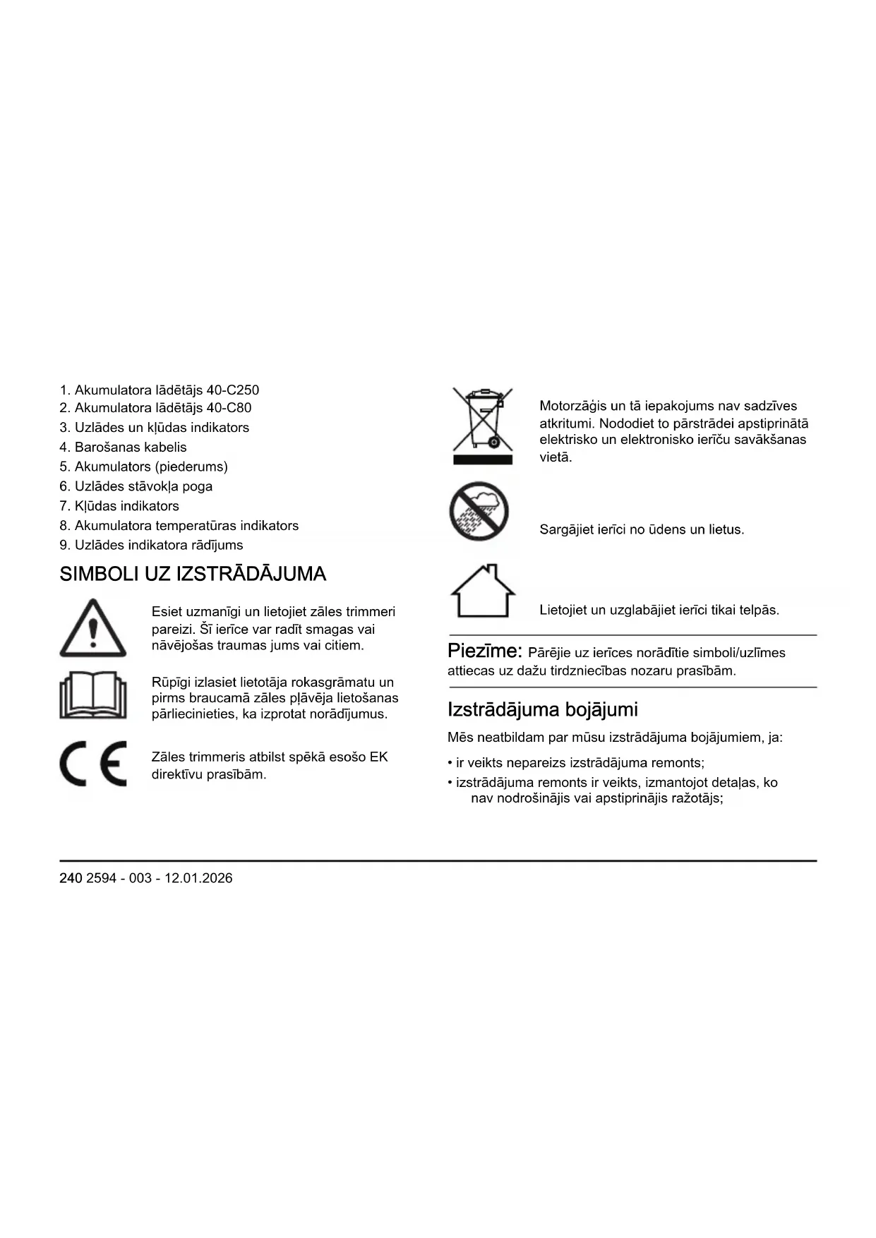 Nelietojiet vienreiz lietojamās baterijas. 242 2594 - 003 - 12.01.2026• Akumulatora lādētāju nedrīkst izjaukt vai remontēt.