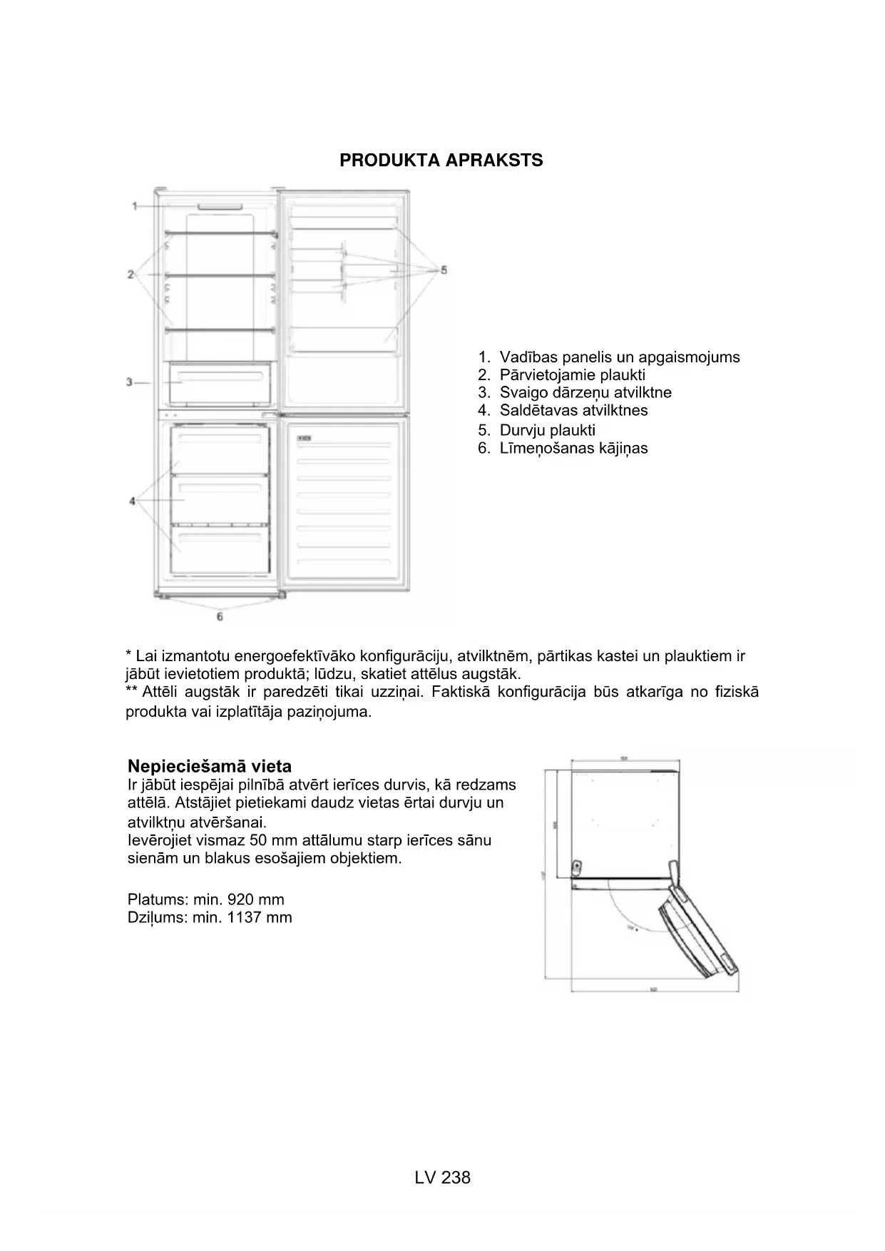 - Lai izmantotu energoefektīvāko konfigurāciju, atvilktnēm, pārtikas kastei un plauktiem ir jābūt ievietotiem produktā; lūdzu, skatiet attēlus augstāk. ** Attēli augstāk ir paredzēti tikai uzziņai. Faktiskā konfigurācija būs atkarīga no fiziskā produkta vai izplatītāja paziņojuma. Nepieciešamā vieta Ir jābūt iespējai pilnībā atvērt ierīces durvis, kā redzams attēlā. Atstājiet pietiekami daudz vietas ērtai durvju un atvilktņu atvēršanai. Ievērojiet vismaz 50 mm attālumu starp ierīces sānu sienām un blakus esošajiem objektiem. Platums: min. 920 mm Dziļums: min. 1137 mmLV 239 LIETOŠANA Ieslēgšanas/izslēgšanas taustiņš — tiek izmantots, lai ieslēgtu/izslēgtu ierīci. Mode taustiņš — tiek izmantots, lai izvēlētos ledusskapja temperatūru vai speciālās funkcijas. Wi-Fi ikona — rāda, vai ierīce ir savienota ar lietotni. Super Cool ikona — rāda, vai funkcija ir aktivizēta. Temperatūras līmeņi — rāda atlasīto temperatūru. Lietošana