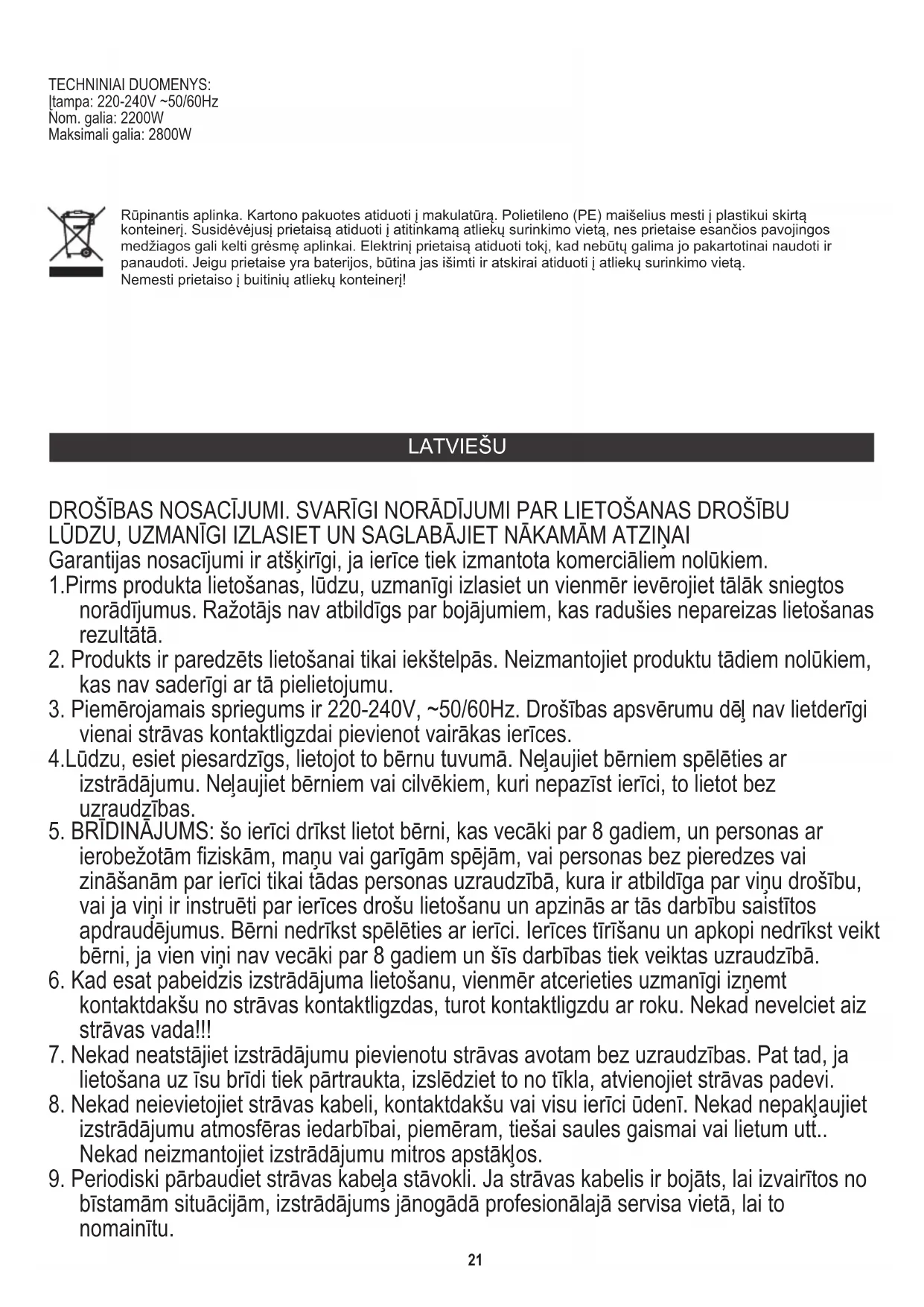 augsta temperatūra Negludināt 23TEHNISKIE DATI: Jauda Nom.: 2200W Spriegums: 220-240V ~50/60Hz Maksimālā jauda: 2800W Apkārtējās vides aizsardzība. Kartona iepakojumu, lūdzu, nododiet otreizējai pārstrādei. Polietilēna maisiņus (PE) izmest plastmasas izstrādājumiem paredzētajos konteineros. Lietotās elektropreces nododiet attiecīgajos pieņemšanas punktos. Ierīcē satur bīstamas sastāvdaļas, kas var izraisīt draudus apkārtējai videi. Elektroierīce jānodod tā, lai ierobežotu tās atkārtotu izmantošanu. Ja ierīcē atrodas baterijas, izņemiet tās un nododiet pieņemšanas punktā atsevišķi. Produktu neizmest sadzīves atkritumu konteinerā! EESTI PALUN LUGEGE HOOLIKALT JA SÄILITA EDASISEKS KASUTAMISEKS Garantiitingimused on erinevad, kui seadet kasutatakse ärilistel eesmärkidel. 6.Pärast toote kasutamise lõpetamist pidage alati meeles, et eemaldaksite pistikut õrnalt pistikupesast, hoides pistikupesast käega kinni. Ärge kunagi tõmmake toitejuhtmest!!!