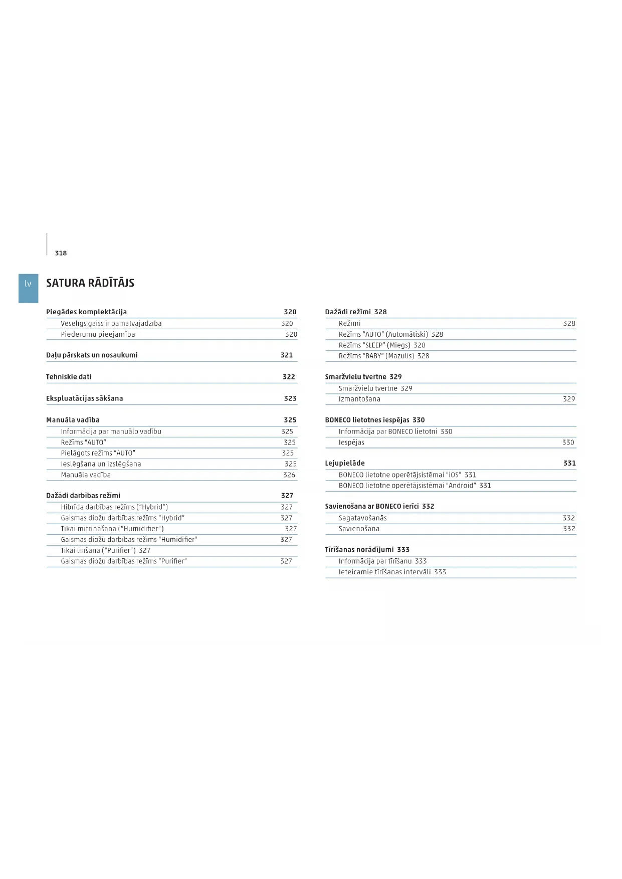 Dažādi režīmi 328 Režīmi 328 Režīms “AUTO” (Automātiski) 328 Režīms “SLEEP” (Miegs) 328 Režīms “BABY” (Mazulis) 328 Smaržvielu tvertne 329 Smaržvielu tvertne 329 Izmantošana 329 BONECO lietotnes iespējas 330 Informācija par BONECO lietotni 330 Iespējas 330 Lejupielāde 331 BONECO lietotne operētājsistēmai “iOS” 331 BONECO lietotne operētājsistēmai “Android” 331 Savienošana ar BONECO ierīci 332 Sagatavošanās 332 Savienošana 332 Tīrīšanas norādījumi 333 Informācija par tīrīšanu 333 Ieteicamie tīrīšanas intervāli 333 Piegādes komplektācija 320 Veselīgs gaiss ir pamatvajadzība 320 Piederumu pieejamība 320 Daļu pārskats un nosaukumi 321 Tehniskie dati 322 Ekspluatācijas sākšana 323 Manuāla vadība 325 Informācija par manuālo vadību 325 Režīms “AUTO” 325 Pielāgots režīms “AUTO” 325 Ieslēgšana un izslēgšana 325 Manuāla vadība 326 Dažādi darbības režīmi 327 Hibrīda darbības režīms (“Hybrid”) 327 Gaismas diožu darbības režīms “Hybrid” 327 Tikai mitrināšana (“Humidifier”) 327 Gaismas diožu darbības režīms “Humidifier” 327 Tikai tīrīšana (“Purifier”) 327 Gaismas diožu darbības režīms “Purifier” 327319