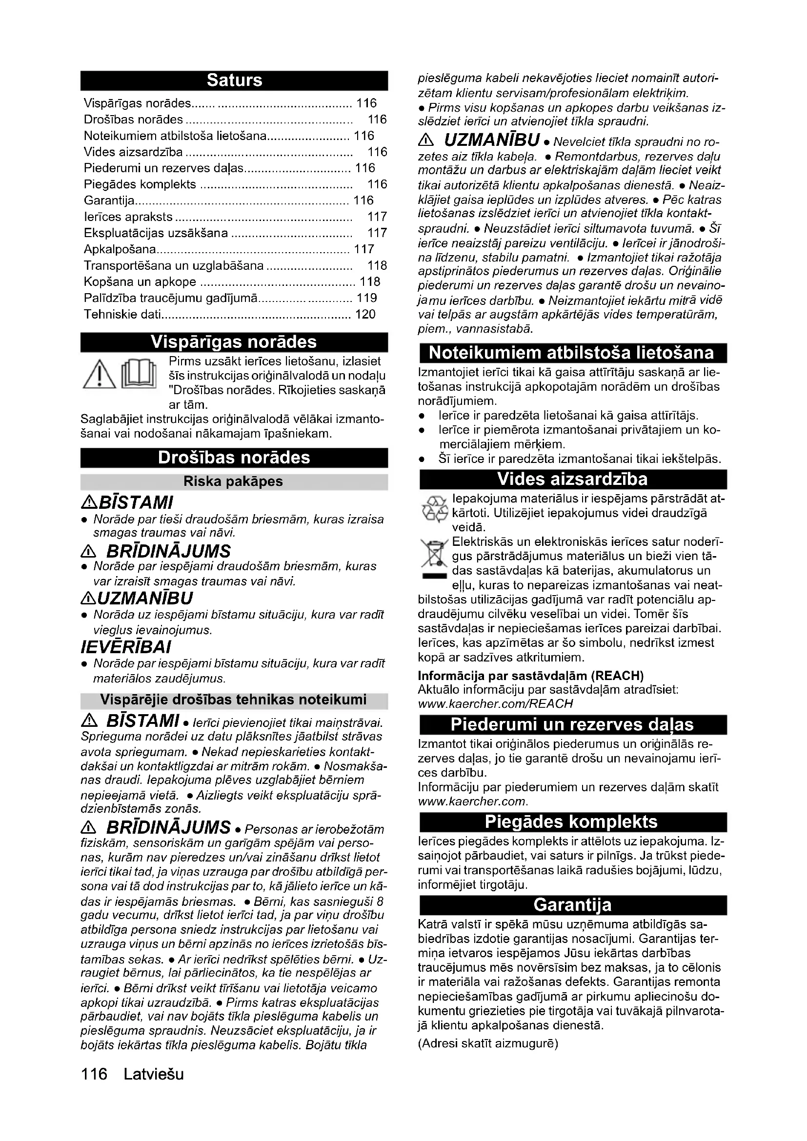 Aktuālo informāciju par sastāvdaļām atradīsiet: www.kaercher.com/REACH Piederumi un rezerves daļas Izmantot tikai oriģinālos piederumus un oriģinālās re- zerves daļas, jo tie garantē drošu un nevainojamu ierī- ces darbību. Informāciju par piederumiem un rezerves daļām skatīt www.kaercher.com. Piegādes komplekts Ierīces piegādes komplekts ir attēlots uz iepakojuma. Iz- saiņojot pārbaudiet, vai saturs ir pilnīgs. Ja trūkst piede- rumi vai transportēšanas laikā radušies bojājumi, lūdzu, informējiet tirgotāju. Garantija Katrā valstī ir spēkā mūsu uzņēmuma atbildīgās sa- biedrības izdotie garantijas nosacījumi. Garantijas ter- miņa ietvaros iespējamos Jūsu iekārtas darbības traucējumus mēs novērsīsim bez maksas, ja to cēlonis ir materiāla vai ražošanas defekts. Garantijas remonta nepieciešamības gadījumā ar pirkumu apliecinošu do- kumentu griezieties pie tirgotāja vai tuvākajā pilnvarota- jā klientu apkalpošanas dienestā. Vispārīgas norādes.......