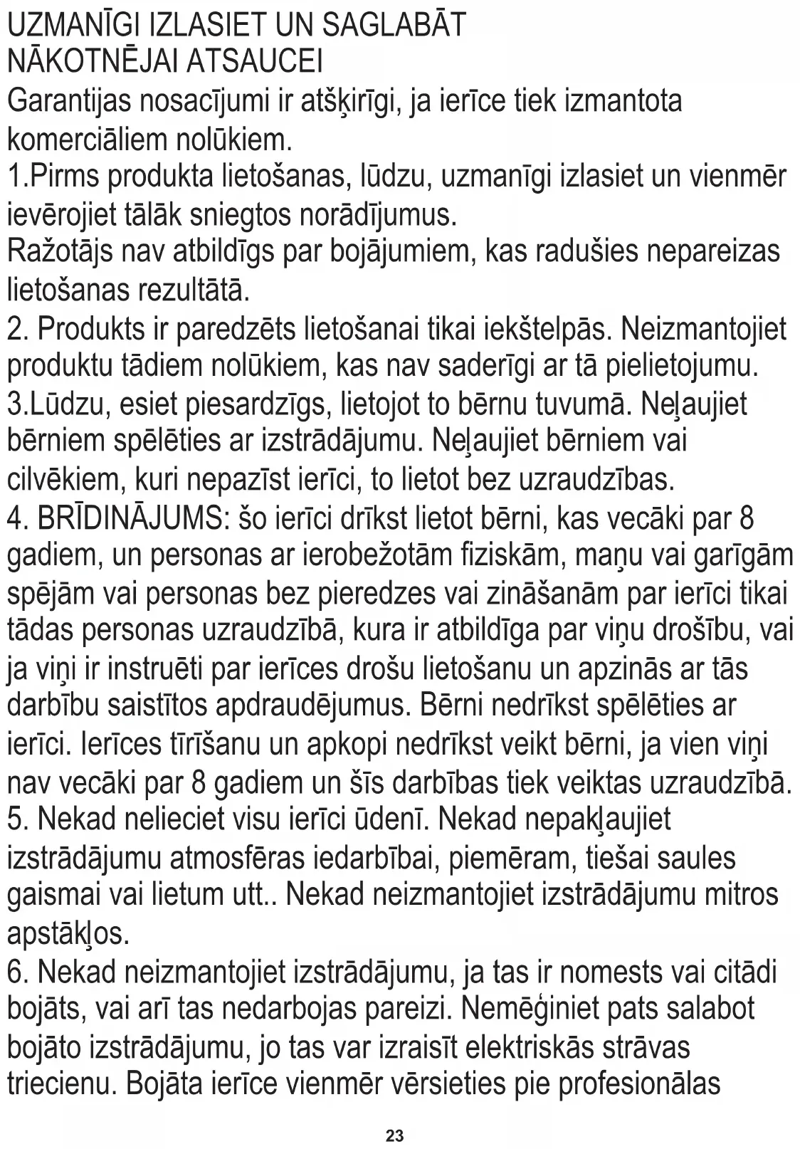 1.Pirms produkta lietošanas, lūdzu, uzmanīgi izlasiet un vienmēr ievērojiet tālāk sniegtos norādījumus. Ražotājs nav atbildīgs par bojājumiem, kas radušies nepareizas lietošanas rezultātā. 3.Lūdzu, esiet piesardzīgs, lietojot to bērnu tuvumā. Neļaujiet bērniem spēlēties ar izstrādājumu. Neļaujiet bērniem vai cilvēkiem, kuri nepazīst ierīci, to lietot bez uzraudzības.24 Ierīce ir piemērota lietošanai zem dušas, taču to var lietot arī sausu. Nelietojiet to kopā ar krēmiem. Ja vēlaties lietot krēmus vai ķermeņa losjonus, uzklājiet tos pēc ierīces lietošanas.