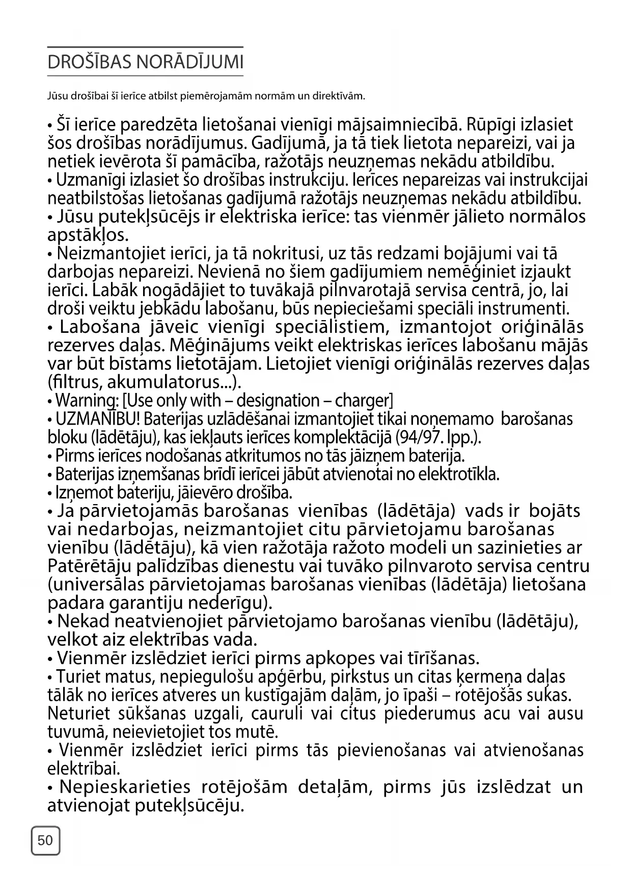 - Labošana jāveic vienīgi speciālistiem, izmantojot oriģinālās rezerves daļas. Mēģinājums veikt elektriskas ierīces labošanu mājās var būt bīstams lietotājam. Lietojiet vienīgi oriģinālās rezerves daļas (ltrus, akumulatorus...).