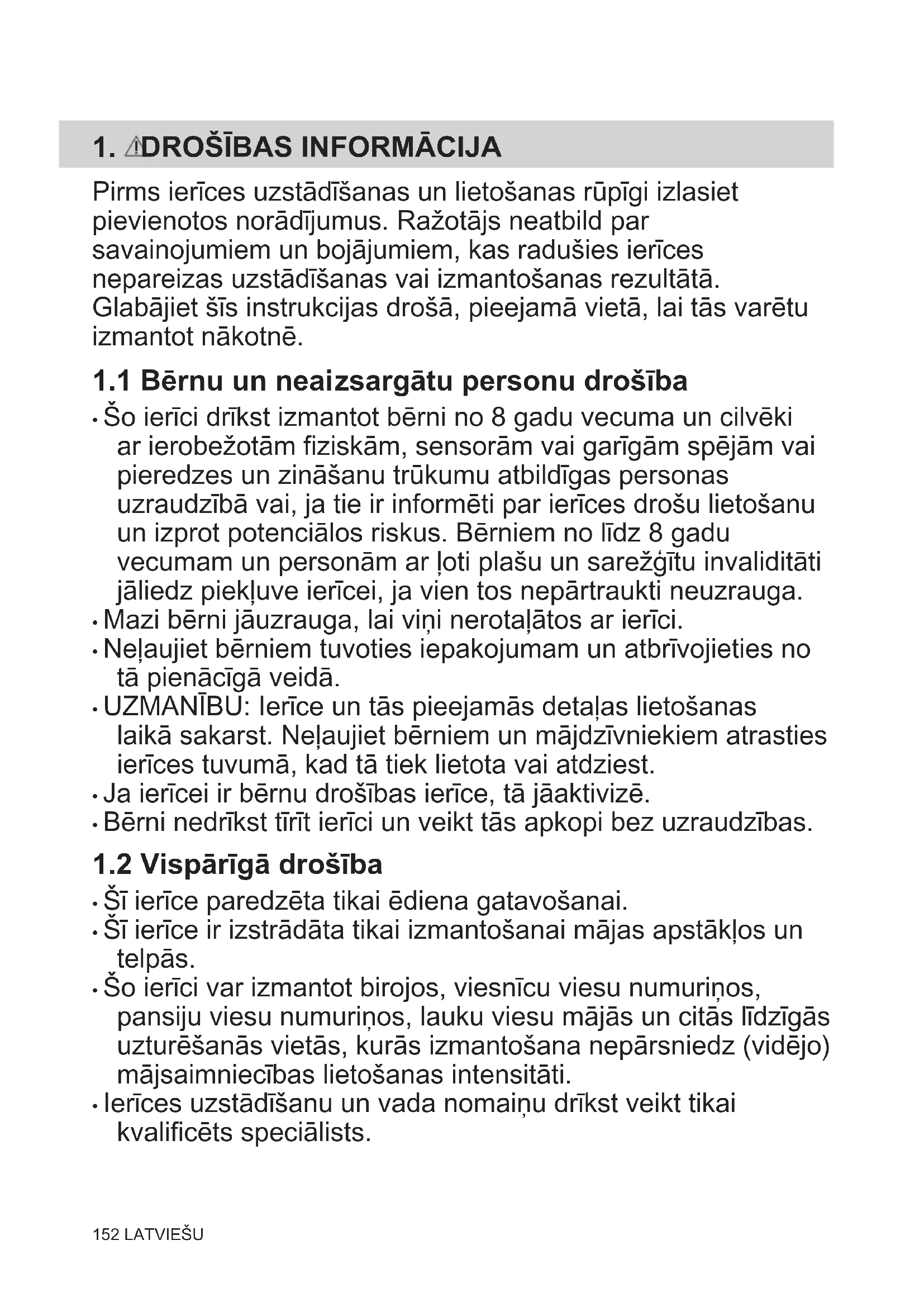 - Šo ierīci drīkst izmantot bērni no 8 gadu vecuma un cilvēki ar ierobežotām fiziskām, sensorām vai garīgām spējām vai pieredzes un zināšanu trūkumu atbildīgas personas uzraudzībā vai, ja tie ir informēti par ierīces drošu lietošanu un izprot potenciālos riskus. Bērniem no līdz 8 gadu vecumam un personām ar ļoti plašu un sarežģītu invaliditāti jāliedz piekļuve ierīcei, ja vien tos nepārtraukti neuzrauga.