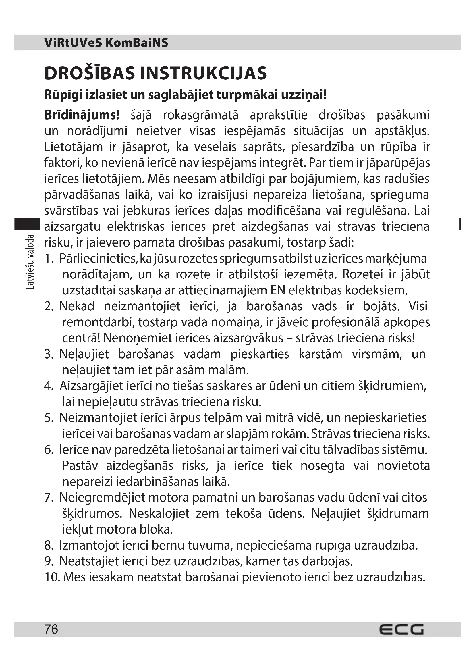 Ietinamais papīrs un kartons – nogādāt pārstrādes punktā. Iepakojuma folija, PE maisi, plastmasas daļas – iemest plastmasas šķirošanas konteineros. ATBRĪVOŠANĀS NO IERĪCĒM KALPOŠANAS LAIKA BEIGĀS Atbrīvošanās no elektriska un elektroniska aprīkojuma (attiecas uz ES dalībvalstīm un citām Eiropas valstīm, kur ieviesta pārstrādes sistēma) Norādītais simbols uz ierīces vai iepakojuma nozīmē, ka ierīci nedrīkst pievienot sadzīves atkritumiem. Nododiet ierīci norādītajā elektriska un elektroniska aprīkojuma pārstrādes punktā. Novērsiet negatīvu ietekmi uz veselību un vidi, parūpējoties par ierīces pareizu pārstrādi. Pārstrāde palīdz taupīt dabas resursus. Lai saņemtu plašāku informāciju par šīs ierīces pārstrādi, sazinieties ar vietējo atbildīgo iestādi, sadzīves atkritumu apstrādes organizāciju vai veikalu, kur ierīci iegādājāties. Šis izstrādājums atbilst ES direktīvu prasībām attiecībā uz elektromagnētisko saderību un elektrodrošību, kā arī uz smago metālu izmantošanu elektriskajā un elektroniskajā aprīkojumā. Turklāt tas atbilst atbilstošajām enerģijas prasībām un prasībām attiecībā uz tiešu saskari ar pārtiku. Lietošanas pamācība ir pieejama vietnē www.ecg-electro.eu. Tiek paturētas tiesības veikt teksta un tehnisko parametru izmaiņas. 08/05Lietuvių kalba Lietuvių kalba