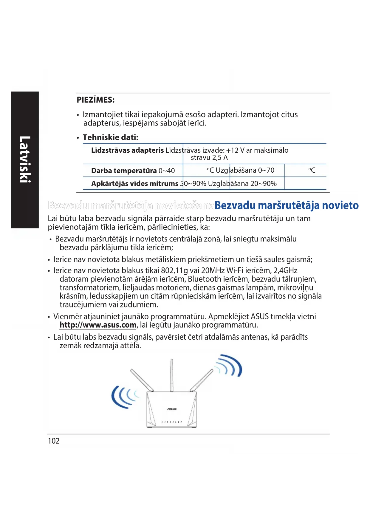 - Naudotojo vadovą galite rasti internete, adresu https://www.asus.com/support101 Latviski Īss aprakstsĪss apraksts Iepakojuma satursIepakojuma saturs RT-AC1750U Maiņstrāvas adapteris Tīkla kabelis (RJ-45) Padomi ātrai darba uzsākšanai LAN 1~4 LEDs WPS poga WAN LED Strāvas (DC-IN) osta 2,4GHz LED Strāvas poga 5GHz LED USB 3.0 osta Barošanas LED WAN (Internet) osta Atiestatīšanas poga LAN 1~4 ostām102 Latviski Bezvadu maršrutētāja novietošanaBezvadu maršrutētāja novietošana Lai būtu laba bezvadu signāla pārraide starp bezvadu maršrutētāju un tam pievienotajām tīkla ierīcēm, pārliecinieties, ka:
