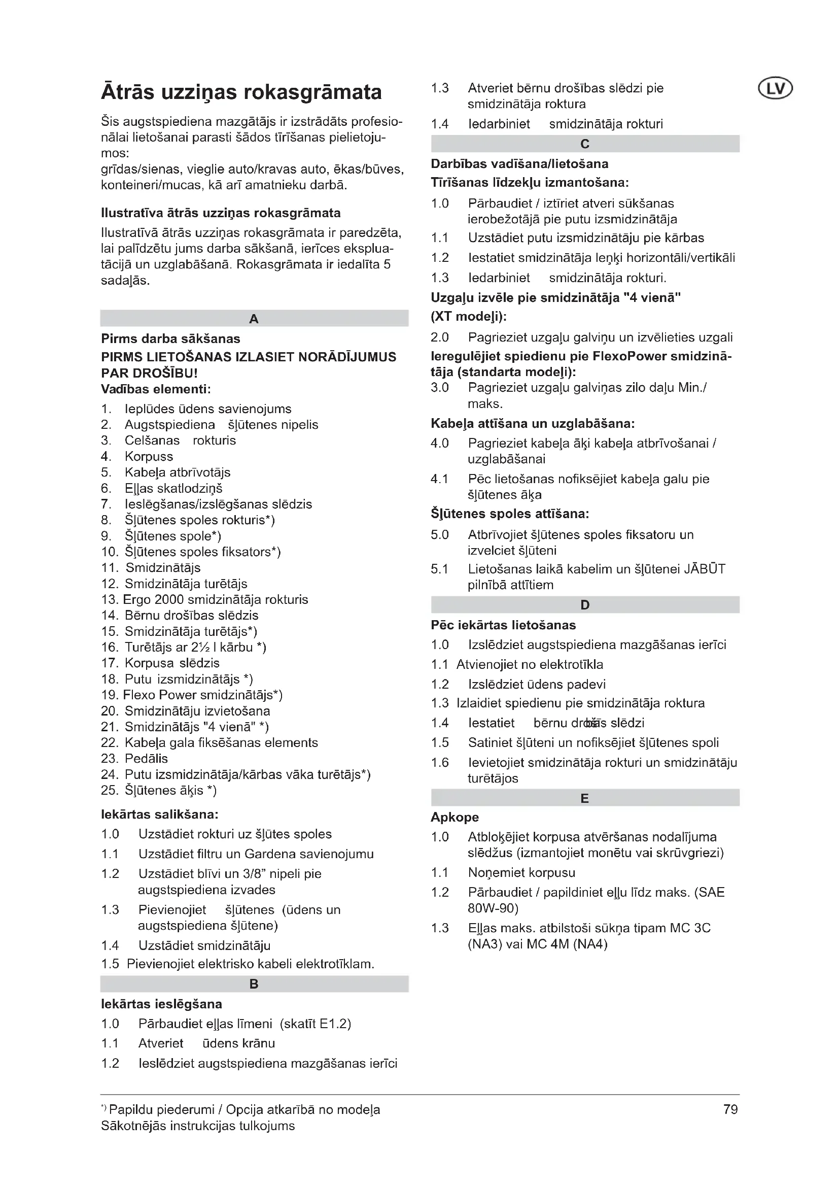 Ātrās uzziņas rokasgrāmata Šis augstspiediena mazgātājs ir izstrādāts profesio- nālai lietošanai parasti šādos tīrīšanas pielietoju- mos: grīdas/sienas, vieglie auto/kravas auto, ēkas/būves, konteineri/mucas, kā arī amatnieku darbā. Ilustratīva ātrās uzziņas rokasgrāmata Ilustratīvā ātrās uzziņas rokasgrāmata ir paredzēta, lai palīdzētu jums darba sākšanā, ierīces eksplua- tācijā un uzglabāšanā. Rokasgrāmata ir iedalīta 5 sadaļās.