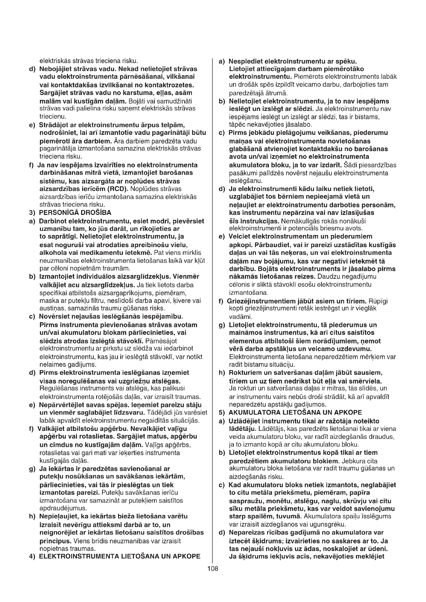 - Izlasiet un saglabājiet šo pamācību.3 TEHNISKIE DATI 1108 a) Nespiediet elektroinstrumentu ar spēku. Lietojiet attiecīgajam darbam piemērotāko elektroinstrumentu. Piemērots elektroinstruments labāk un drošāk spēs izpildīt veicamo darbu, darbojoties tam paredzētajā ātrumā. b) Nelietojiet elektroinstrumentu, ja to nav iespējams ieslēgt un izslēgt ar slēdzi. Ja elektroinstrumentu nav iespējams ieslēgt un izslēgt ar slēdzi, tas ir bīstams, tāpēc nekavējoties jāsalabo. c) Pirms jebkādu pielāgojumu veikšanas, piederumu maiņas vai elektroinstrumenta novietošanas glabāšanā atvienojiet kontaktdakšu no barošanas avota un/vai izņemiet no elektroinstrumenta akumulatora bloku, ja to var izdarīt. Šādi piesardzības pasākumi palīdzēs novērst nejaušu elektroinstrumenta ieslēgšanu. d) Ja elektroinstrumenti kādu laiku netiek lietoti, uzglabājiet tos bērniem nepieejamā vietā un neļaujiet ar elektroinstrumentu darboties personām, kas instrumentu nepārzina vai nav izlasījušas šīs instrukcijas. Nemākulīgās rokās nonākuši elektroinstrumenti ir potenciāls briesmu avots. e) Veiciet elektroinstrumentam un piederumiem apkopi. Pārbaudiet, vai ir pareizi uzstādītas kustīgās daļas un vai tās neķeras, un vai elektroinstrumenta daļām nav bojājumu, kas var negatīvi ietekmēt tā darbību. Bojāts elektroinstruments ir jāsalabo pirms nākamās lietošanas reizes. Daudzu negadījumu cēlonis ir sliktā stāvoklī esošu elektroinstrumentu izmantošana. f) Griezējinstrumentiem jābūt asiem un tīriem. Rūpīgi kopti griezējinstrumenti retāk iestrēgst un ir vieglāk vadāmi. g) Lietojiet elektroinstrumentu, tā piederumus un maināmos instrumentus, kā arī citus saistītos elementus atbilstoši šiem norādījumiem, ņemot vērā darba apstākļus un veicamo uzdevumu. Elektroinstrumenta lietošana neparedzētiem mērķiem var radīt bīstamu situāciju. h) Rokturiem un satveršanas daļām jābūt sausiem, tīriem un uz tiem nedrīkst būt eļļa vai smērviela. Ja rokturi un satveršanas daļas ir mitras, tās slīdēs, un ar instrumentu vairs nebūs droši strādāt, kā arī apvaldīt neparedzētu apstākļu gadījumos.