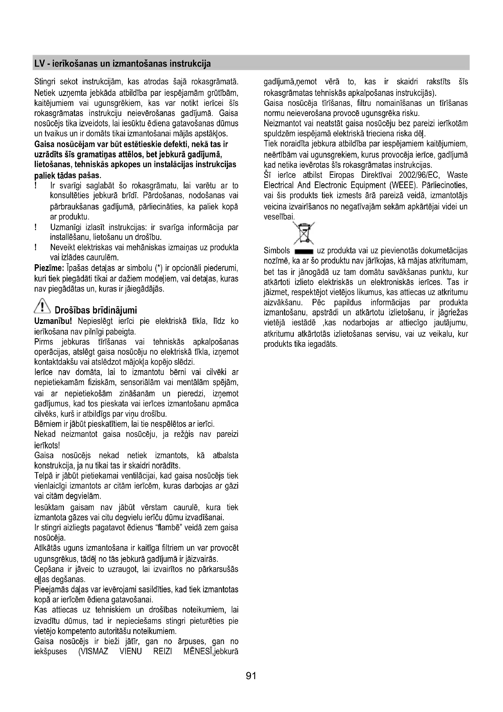 tlikę filtrų priežiūros darbus ir įjungę gaubtą, paspauskite ir laikykite nuspaudę mygtuką, kol išgirsite garso signalą. Mirksintis šviesos diodas 1 (riebalų filtras) arba 2 (anglies filtras) nustos mirksėti. ELEKTROS ATJUNGIMAS Mygtuką laikykite paspaudę 3 sekundes, kol bus atjungta gaubto valdymo elektra. Ši funkcija gali praversti valant gaminį. Norėdami vėl įjungti elektrą, pakartokite veiksmą. Galimų veikimo sutrikimų atveju, prieš kreipdamiesi į specialistą, bent 5 sekundėm išjunkite aparatą iš elektros tinklo ištraukdami kištuką, po to vėl įjunkite. Tuo atveju, jei veikimo sutrikimas neišnyktų, kreipkitės pagalbos į specialistus. Priežiūra Dėmesio! Prieš valydami prietaisą, išjunkite jį iš elektros tinklo. Ištraukite kištuką iš rozetės arba išjunkite pagrindinį namų elektros jungiklį. Valymas Gaubtą reikia nuolat valyti (bent jau taip pat dažnai kaip ir prižiūrint riebalų filtrus), tiek iš vidaus, tiek ir iš išorės. Valymui naudoti šluostę, suvilgytą skystu neutraliu valikliu. Nenaudokite abrazyvinių valymo priemonių. NENAUDOKITE SPIRITO! Dėmesio: netinkamai valant prietaisą bei nesilaikant filtrų keitimo normų gali kilti gaisro pavojus. Todėl rekomenduojama laikytis pateiktų nurodymų. Gamintojas neprisiima jokios atsakomybės už gaisrą bei galimus variklio gedimus, kilusius dėl netinkamos priežiūros arba dėl šių nurodymų nesilaikymo. Nuo riebalų saugantis filtras 19-25 pav. Sulaiko kepamų riebalų daleles. Filtrą valykite kartą per mėnesį (ar kai filtrų perpildymo indikacijos sistema, jei tokia numatyta turimame modelyje, rodo tokią būtinybę). Valykite švelniais valikliais rankiniu būdu ar indaplovėje pagal atitinkamą temperatūrą ir trumpuoju ciklu. Plaunant metalinį nuo riebalų saugantį filtrą indaplovėje, jis gali prarasti spalvą, bet jo filtravimo savybės išliks nepakitusios. Norėdami išmontuoti riebalų filtrą, patraukite spyruoklinę atkabinimo rankeną. Anglies filtras (tik filtravimo režimu) 23 pav. Naikina nemalonius kvapus, atsirandančius maisto gaminimo metu. Anglies filtrą galima plauti kas du mėnesius (arba kai filtrų prisotinimo signalizavimo sistema – jeigu ji numatyta turimame modelyje – rodo, kad reikia) šiltu vandeniu specialiai tam pritaikytais plovikliais arba indaplovėje 65 °C temperatūroje (jei filtrą plaunate indaplovėje, nustatykite visą plovimo ciklą, filtrą plaukite atskirai nuo kitų indų). Susikaupusį vandenį nupilkite nepažeisdami filtro, paskui įdėkite filtrą 10 minučių į iki 100 °C įkaitintą orkaitę, kad galutinai išdžiūtų. Pagalvėlę keiskite kas 3 metus arba anksčiau, jei pastebėjote, kad audeklas pažeistas. Lempų keitimas Gartraukyje įrengta diodų technologijos apšvietimo sistema. Diodai užtikrina optimalų apšvietimą, be to, jų naudojimo laikas iki 10 kartų ilgesnis nei tradicinių lempučių, taigi sutaupoma 90 % elektros energijos. Jei norite juos pakeisti, kreipkitės į techninio aptarnavimo tarnybą.91 LV - ierīkošanas un izmantošanas instrukcija Stingri sekot instrukcijām, kas atrodas šajā rokasgrāmatā. Netiek uzņemta jebkāda atbildība par iespējamām grūtībām, kaitējumiem vai ugunsgrēkiem, kas var notikt ierīcei šīs rokasgrāmatas instrukciju neievērošanas gadījumā. Gaisa nosūcējs tika izveidots, lai iesūktu ēdiena gatavošanas dūmus un tvaikus un ir domāts tikai izmantošanai mājās apstākļos. Gaisa nosūcējam var būt estētieskie defekti, nekā tas ir uzrādīts šīs gramatiņas attēlos, bet jebkurā gadījumā, lietošanas, tehniskās apkopes un instalācijas instrukcijas paliek tā das pašas. ! Ir svarīgi saglabāt šo rokasgrāmatu, lai varētu ar to konsultēties jebkurā brīdī. Pārdošanas, nodošanas vai pārbraukšanas gadījumā, pārliecināties, ka paliek kopā ar produktu. ! Uzmanīgi izlasīt instrukcijas: ir svarīga informācija par installēšanu, lietošanu un drošību. ! Neveikt elektriskas vai mehāniskas izmaiņas uz produkta vai izlādes caurulēm. Piezīme: Īpašas detaļas ar simbolu (*) ir opcionāli piederumi, kuri tiek piegādāti tikai ar dažiem modeļiem, vai detaļas, kuras nav piegādātas un, kuras ir jāiegādājās. Drošības brīdinājumi Uzmanību! Nepieslēgt ierīci pie elektriskā tīkla, līdz ko ierīkošana nav pilnīgi pabeigta. Pirms jebkuras tīrīšanas vai tehniskās apkalpošanas operācijas, atslēgt gaisa nosūcēju no elektriskā tīkla, izņemot kontaktdakšu vai atslēdzot mājokļa kopējo slēdzi. Ierīce nav domāta, lai to izmantotu bērni vai cilvēki ar nepietiekamām fiziskām, sensoriālām vai mentālām spējām, vai ar nepietiekošām zināšanām un pieredzi, izņemot gadījumus, kad tos pieskata vai ierīces izmantošanu apmāca cilvēks, kurš ir atbildīgs par viņu droš ību. Bērniem ir jābūt pieskatītiem, lai tie nespēlētos ar ierīci. Nekad neizmantot gaisa nosūcēju, ja režģis nav pareizi ierīkots! Gaisa nosūcējs nekad netiek izmantots, kā atbalsta konstrukcija, ja nu tikai tas ir skaidri norādīts. Telpā ir jābūt pietiekamai ventilācijai, kad gaisa nosūcējs tiek vienlaicīgi izmantots ar citām ierīcēm, kuras darbojas ar gāzi vai citām degvielām. Iesūktam gaisam nav jābūt vērstam caurulē, kura tiek izmantota gāzes vai citu degvielu ierīču dūmu izvadīšanai. Ir stingri aizliegts pagatavot ēdienus “flambē” veidā zem gaisa nosūcēja. Atlk ātās uguns izmantošana ir kaitīga filtriem un var provocēt ugunsgrēkus, tādēļ no tās jebkurā gadījumā ir jāizvairās. Cepšana ir jāveic to uzraugot, lai izvairītos no pārkarsušās eļļas degšanas. Pieejamās daļas var ievērojami sasildīties, kad tiek izmantotas kopā ar ierīcēm ēdiena gatavošanai. Kas attiecas uz tehniskiem un drošības noteikumiem, lai izvadītu dūmus, tad ir nepieciešams stingri pieturēties pie vietējo kompetento autoritāšu noteikumie