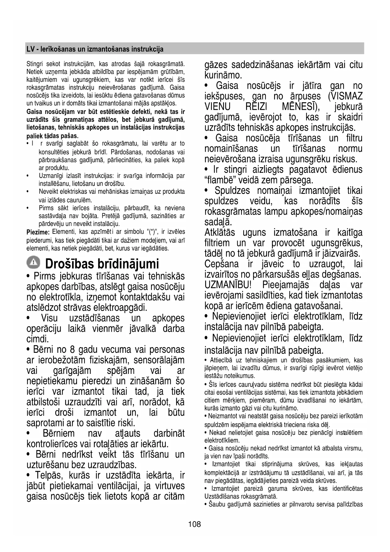 - Telpās, kurās ir uzstādīta iekārta, ir jābūt pietiekamai ventilācijai, ja virtuves gaisa nosūcējs tiek lietots kopā ar citām gāzes sadedzināšanas iekārtām vai citu kurināmo.