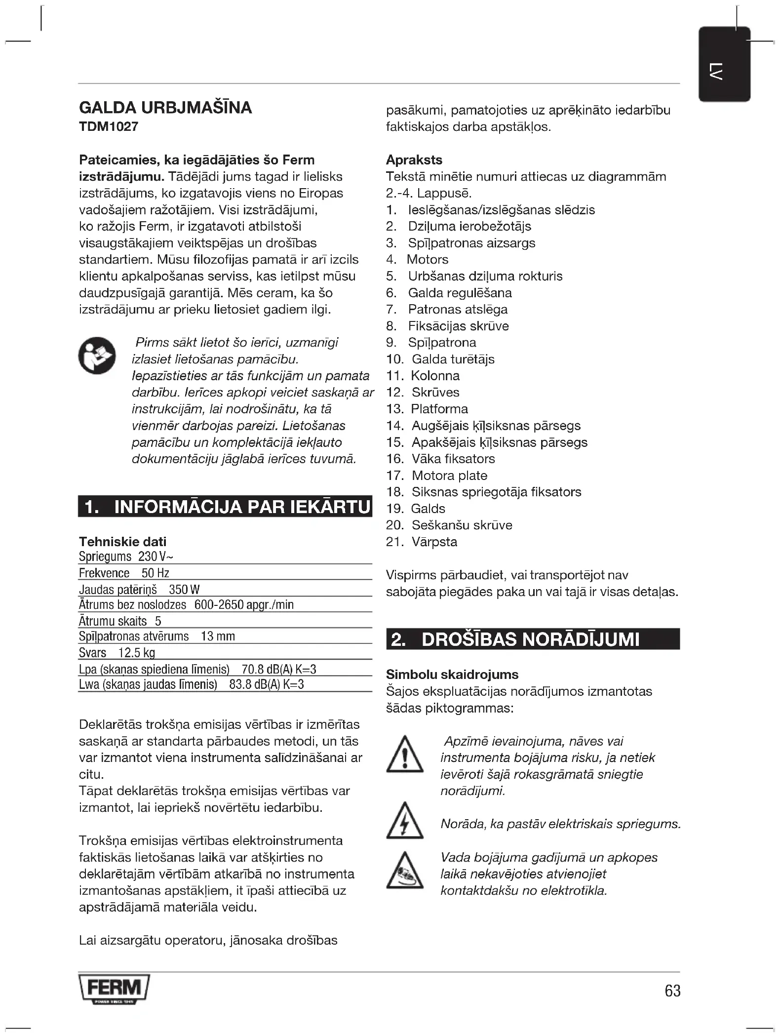 TDM1027 Pateicamies, ka iegādājāties šo Ferm izstrādājumu. Tādējādi jums tagad ir lielisks izstrādājums, ko izgatavojis viens no Eiropas vadošajiem ražotājiem. Visi izstrādājumi, ko ražojis Ferm, ir izgatavoti atbilstoši visaugstākajiem veiktspējas un drošības standartiem. Mūsu filozofijas pamatā ir arī izcils klientu apkalpošanas serviss, kas ietilpst mūsu daudzpusīgajā garantijā. Mēs ceram, ka šo izstrādājumu ar prieku lietosiet gadiem ilgi. Pirmssāktlietotšoierīci,uzmanīgi izlasietlietošanaspamācību. Iepazīstietiesartāsfunkcijāmunpamata darbību.Ierīcesapkopiveicietsaskaņāar instrukcijām,lainodrošinātu,katā vienmērdarbojaspareizi.Lietošanas pamācībuunkomplektācijāiekļauto dokumentācijujāglabāierīcestuvumā.