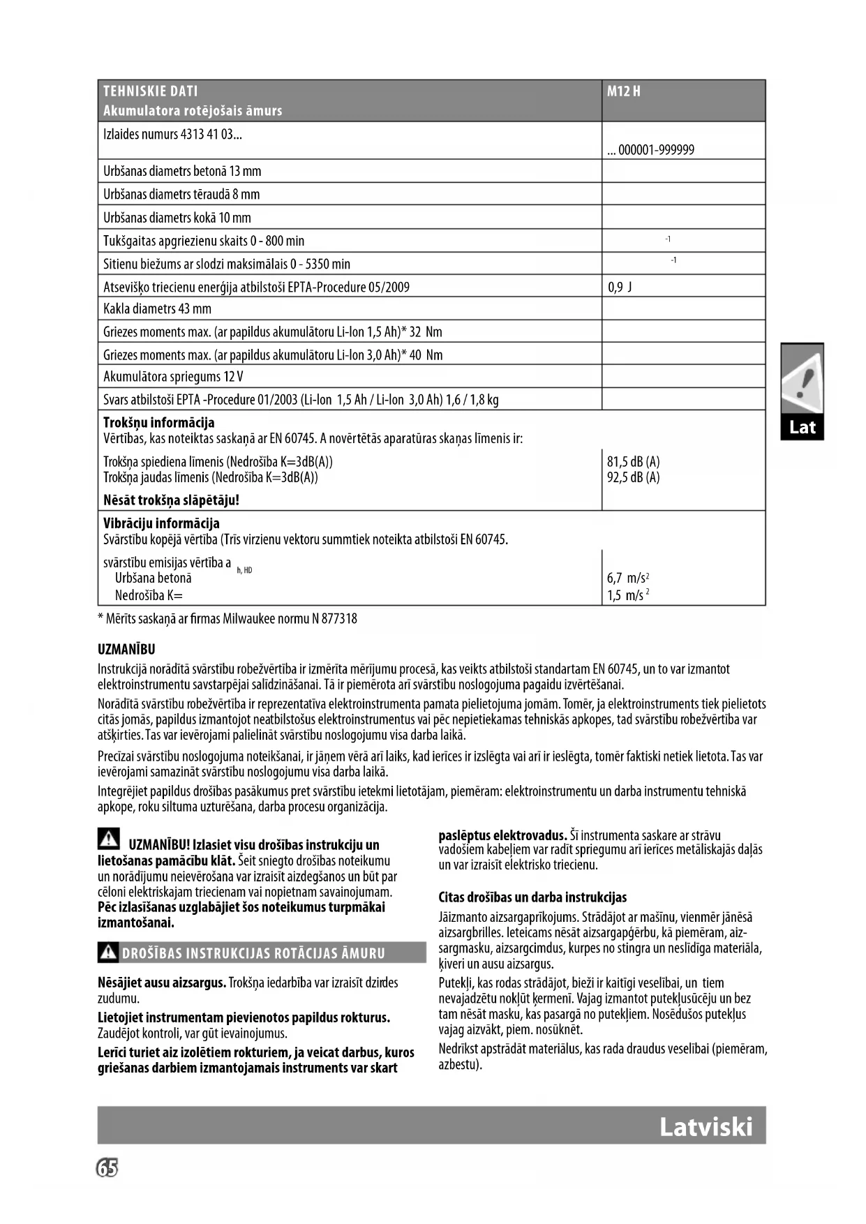 Nēsājiet ausu aizsargus. Trokšņa iedarbība var izraisīt dzirdes zudumu. Lietojiet instrumentam pievienotos papildus rokturus. Zaudējot kontroli, var gūt ievainojumus. Lerīci turiet aiz izolētiem rokturiem, ja veicat darbus, kuros griešanas darbiem izmantojamais instruments var skart paslēptus elektrovadus. Šī instrumenta saskare ar strāvu vadošiem kabeļiem var radīt spriegumu arī ierīces metāliskajās daļās un var izraisīt elektrisko triecienu. Citas drošības un darba instrukcijas Jāizmanto aizsargaprīkojums. Strādājot ar mašīnu, vienmēr jānēsā aizsargbrilles. Ieteicams nēsāt aizsargapģērbu, kā piemēram, aiz- sargmasku, aizsargcimdus, kurpes no stingra un neslīdīga materiāla, ķiveri un ausu aizsargus. Putekļi, kas rodas strādājot, bieži ir kaitīgi veselībai, un tiem nevajadzētu nokļūt ķermenī. Vajag izmantot putekļusūcēju un bez tam nēsāt masku, kas pasargā no putekļiem. Nosēdušos putekļus vajag aizvākt, piem. nosūknēt. Nedrīkst apstrādāt materiālus, kas rada draudus veselībai (piemēram, azbestu). TEHNISKIE DATI Akumulatora rotējošais āmurs M12 H Izlaides numurs 4313 41 03... ... 000001-999999 Urbšanas diametrs betonā 13 mm Urbšanas diametrs tēraudā 8 mm Urbšanas diametrs kokā 10 mm Tukšgaitas apgriezienu skaits 0 - 800 min