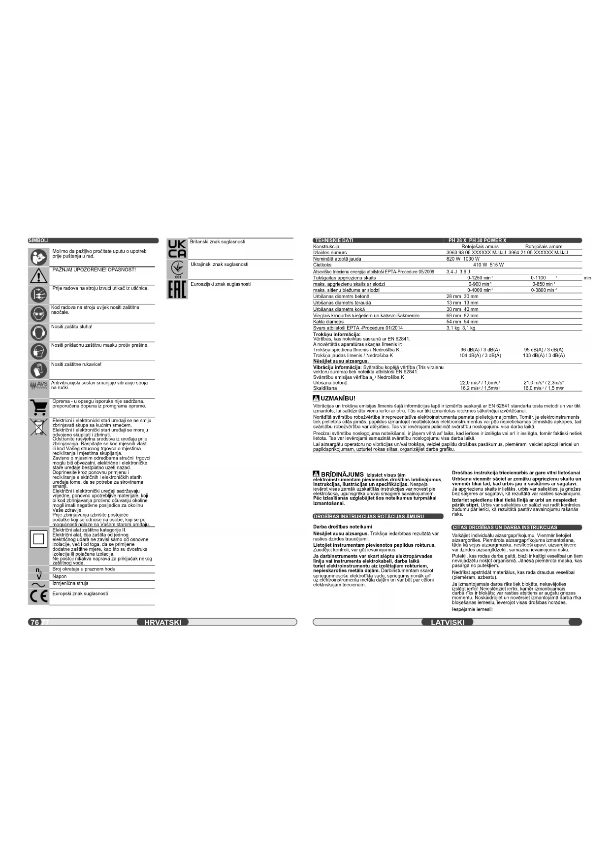 Napon Izmjenična struja Europski znak suglasnosti Britanski znak suglasnosti Ukrajinski znak suglasnosti Euroazijski znak suglasnosti HRVATSKI Rotējošais āmurs Rotējošais āmurs LATVISKI78 79 SIMBOLI Pirms sākt lietot instrumentu, lūdzu, izlasiet lietošanas pamācību. UZMANĪBU! BÎSTAMI! Pirms jebkādiem darbiem, kas attiecas uz mašīnas apkopi, mašīnu noteikti vajag atvienot no kontaktligzdas. Strādājot ar mašīnu, vienmēr jānēsā aizsargbrilles. Nēsāt trokšņa slāpētāju! Jānēsā piemērota maska, kas pasargā no putekļiem. Jāvalkā aizsargcimdi! Pretvibrācijas sistēma samazina mašīnas vibrāciju uz roktura. Piederumi - standartaprīkojumā neietvertās, bet ieteicamās papildus komplektācijas detaļas no piederumu programmas. Neutilizējiet elektrisko un elektronisko iekārtu atkritumus kā nešķirotus sadzīves atkritumus. Elektrisko un elektronisko iekārtu atkritumi ir jāsavāc atsevišķi. Gaismas avotu atkritumi ir jānoņem no iekārtas. Sazinieties ar vietējo iestādi vai mazumtirgotāju, lai iegūtu padomus par otrreizējo pārstrādi un savākšanas punktu. Atkarībā no vietējiem noteikumiem, mazumtirgotājiem var būt pienākums bez maksas pieņemt atpakaļ elektriskās, elektroniskās vai vecās iekārtas. Jūsu ieguldījums elektrisko un elektronisko iekārtu atkritumu atkārtotā izmantošanā un otrreizējā pārstrādē pal īdz samazināt pieprasījumu pēc izejvielām. Elektrisko un elektronisko iekārtu atkritumos ir vērtīgi, otrreiz pārstrādājami materiāli, kas var negatīvi ietekmēt vidi un cilvēku veselību, ja tie netiek utilizēti videi draudzīgā veidā. No iekārtu atkritumiem izdzēsiet personāla datus, ja tādi ir. II aizsardzības klases elektroinstruments. Elektroinstruments, kuram aizsardzība pret elektrisko triecienu ir atkarīga ne tikai no pamata izolācijas, bet arī no tā, ka tiek piemēroti papildu aizsardzības pasākumi, piemēram, dubultā izolācija vai pastiprināta izolācija. Aizsarga pieslēgšanai instrumenti nav paredzēti.