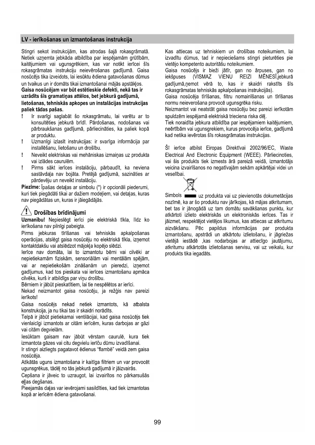 spragtelėjimas). Jei apšvietimas neveiks, prieš kviesdami techninę pagalbą, patikrinkite, ar lempas įstatėte teisinga pozicija. - Modelis su LED lempomis Gartraukyje įrengta diodų technologijos apšvietimo sistema. Diodai užtikrina optimalų apšvietimą, be to, jų naudojimo laikas iki 10 kartų ilgesnis nei tradicinių lempučių, taigi sutaupoma 90 % elektros energijos. Jei norite juos pakeisti, kreipkitės į techninio aptarnavimo tarnybą.99 LV - ierīkošanas un izmantošanas instrukcija Stingri sekot instrukcijām, kas atrodas šajā rokasgrāmatā. Netiek uzņemta jebkāda atbildība par iespējamām grūtībām, kaitējumiem vai ugunsgrēkiem, kas var notikt ierīcei šīs rokasgrāmatas instrukciju neievērošanas gadījumā. Gaisa nosūcējs tika izveidots, lai iesūktu ēdiena gatavošanas dūmus un tvaikus un ir domāts tikai izmantošanai mājās apstākļos. Gaisa nosūcējam var būt estētieskie defekti, nekā tas ir uzrādīts šīs gramatiņas attēlos, bet jebkurā gadījumā, lietošanas, tehniskās apkopes un instalācijas instrukcijas paliek tā das pašas. ! Ir svarīgi saglabāt šo rokasgrāmatu, lai varētu ar to konsultēties jebkurā brīdī. Pārdošanas, nodošanas vai pārbraukšanas gadījumā, pārliecināties, ka paliek kopā ar produktu. ! Uzmanīgi izlasīt instrukcijas: ir svarīga informācija par installēšanu, lietošanu un drošību. ! Neveikt elektriskas vai mehāniskas izmaiņas uz produkta vai izlādes caurulēm. ! Pirms sākt ierīces instalāciju, pārbaudīt, ka neviena sastāvdaļa nav bojāta. Pretējā gadījumā, sazināties ar pārdevēju un neveikt instalāciju. Piezīme: Īpašas detaļas ar simbolu (*) ir opcionāli piederumi, kuri tiek piegādāti tikai ar dažiem modeļiem, vai detaļas, kuras nav piegādātas un, kuras ir jāiegādājās. Drošības brīdinājumi Uzmanību! Nepieslēgt ierīci pie elektriskā tīkla, līdz ko ierīkošana nav pilnīgi pabeigta. Pirms jebkuras tīrīšanas vai tehniskās apkalpošanas operācijas, atslēgt gaisa nosūcēju no elektriskā tīkla, izņemot kontaktdakšu vai atslēdzot mājokļa kopējo slēdzi. Ierīce nav domāta, lai to izmantotu bērni vai cilvēki ar nepietiekamām fiziskām, sensoriālām vai mentālām spējām, vai ar nepietiekošām zināšanām un pieredzi, izņemot gadījumus, kad tos pieskata vai ierīces izmantošanu apmāca cilvēks, kurš ir atbildīgs par viņu droš ību. Bērniem ir jābūt pieskatītiem, lai tie nespēlētos ar ierīci. Nekad neizmantot gaisa nosūcēju, ja režģis nav pareizi ierīkots! Gaisa nosūcējs nekad netiek izmantots, kā atbalsta konstrukcija, ja nu tikai tas ir skaidri norādīts. Telpā ir jābūt pietiekamai ventilācijai, kad gaisa nosūcējs tiek vienlaicīgi izmantots ar citām ierīcēm, kuras darbojas ar gāzi vai citām degvielām. Iesūktam gaisam nav jābūt vērstam caurulē, kura tiek izmantota gāzes vai citu degvielu ierīču dūmu izvadīšanai. Ir stingri aizliegts pagatavot ēdienus “flambē” veidā zem gaisa nosūcēja. Atlk ātās uguns izmantošana ir kaitīga filtriem un var provocēt ugunsgrēkus, tādēļ no tās jebkurā gadījumā ir jāizvairās. Cepšana ir jāveic to uzraugot, lai izvairītos no pārkarsušās eļļas degšanas. Pieejamās daļas var ievērojami sasildīties, kad tiek izmantotas kopā ar ierīcēm ēdiena gatavošanai. Kas attiecas uz tehniskiem un drošības noteikumiem, lai izvadītu dūmus, tad ir nepieciešams stingri pieturēties pie vietējo kompetento autoritāšu noteikumiem. Gaisa nosūcējs ir bieži jātīr, gan no ārpuses, gan no iekšpuses (VISMAZ VIENU REIZI MĒNESĪ,jebkurā gadījumā,ņemot vērā to, kas ir skaidri rakst īts šīs rokasgrāmatas tehniskās apkalpošanas instrukcijās). Gaisa nosūcēja tīrīšanas, filtru nomainīšanas un tīrīšanas normu neieverošana provocē ugunsgrēka risku. Neizmantot vai neatstāt gaisa nosūcēju bez pareizi ierīkotām spuldzēm iespējamā elektriskā trieciena riska dēļ. Tiek noraidīta jebkura atbildība par iespējamiem kaitējumiem, neērtībām vai ugunsgrekiem, kurus provocēja ierīce, gadījumā kad netika ievērotas šīs rokasgrāmatas instrukcijas. Šī ierīce atbilst Eiropas Direktīvai 2002/96/EC, Waste Electrical And Electronic Equipment (WEEE). Pārliecinoties, vai šis produkts tiek izmests ārā pareizā veidā, izmantotājs veicina izvairīšanos no negatīvajām sekām apkārtējai videi un veselībai. Simbols uz produkta vai uz pievienotās dokumetācijas nozīmē, ka ar šo produktu nav jārīkojas, kā mājas atkritumam, bet tas ir jānogādā uz tam domātu savākšanas punktu, kur atkārtoti izlieto elektriskās un elektroniskās ierīces. Tas ir jāizmet, respektējot vietējos likumus, kas attiecas uz atkritumu aizvākšanu. Pēc papildus informācijas par produkta izmantošanu, apstrādi un atkārtotu izlietošanu, ir jāgriežas vietējā iestādē ,kas nodarbojas ar attiecīgo jautājumu, atkritumu atkārtotās izlietošanas servisu, vai uz veikalu, kur produkts tika iegadāts.100 Izmantošana Gaisa nosūcējs ir veidots, lai to izmantotu iesūkšanas versijā ar evakuāciju uz ārpusi vai filtrēšanas versijā ar iekšējo recirkulāciju. Iesūkšanas versija Tvaiki tiek izvadīti uz ārpusi, caur izvadīšanas cauruli, kas ir piefiksēts pie atloksavienojuma. Izvadīšanas curule diametram ir jābūt vienlīdzīgam ar savienošanas gredzena diametru. Uzmanību! Evakuācijas caurule nav dota līdzi un tā ir jāiegādājas. Horizontālā daļā, caurulei ir jābūt vieglam slīpumam uz augšpusi (aptuveni 10°), tadā veidā lai varētu pārvietot gaisu uz ārpusi pēc iespējas vienkāršāk. Ja gaisa nosūcējam ir ogļu filtri, tiem ir jābūt noņemtiem. Pievienot gaisa nosūcēju pie izvadīšanas sienas caurulēm un atvērumiem ar diametru, kas ir vienāds gaisa izejas diametram (savienošanas atloks). Sienas izvadī šanas cauruļu un atvērumu izmantošana ar mazāku d